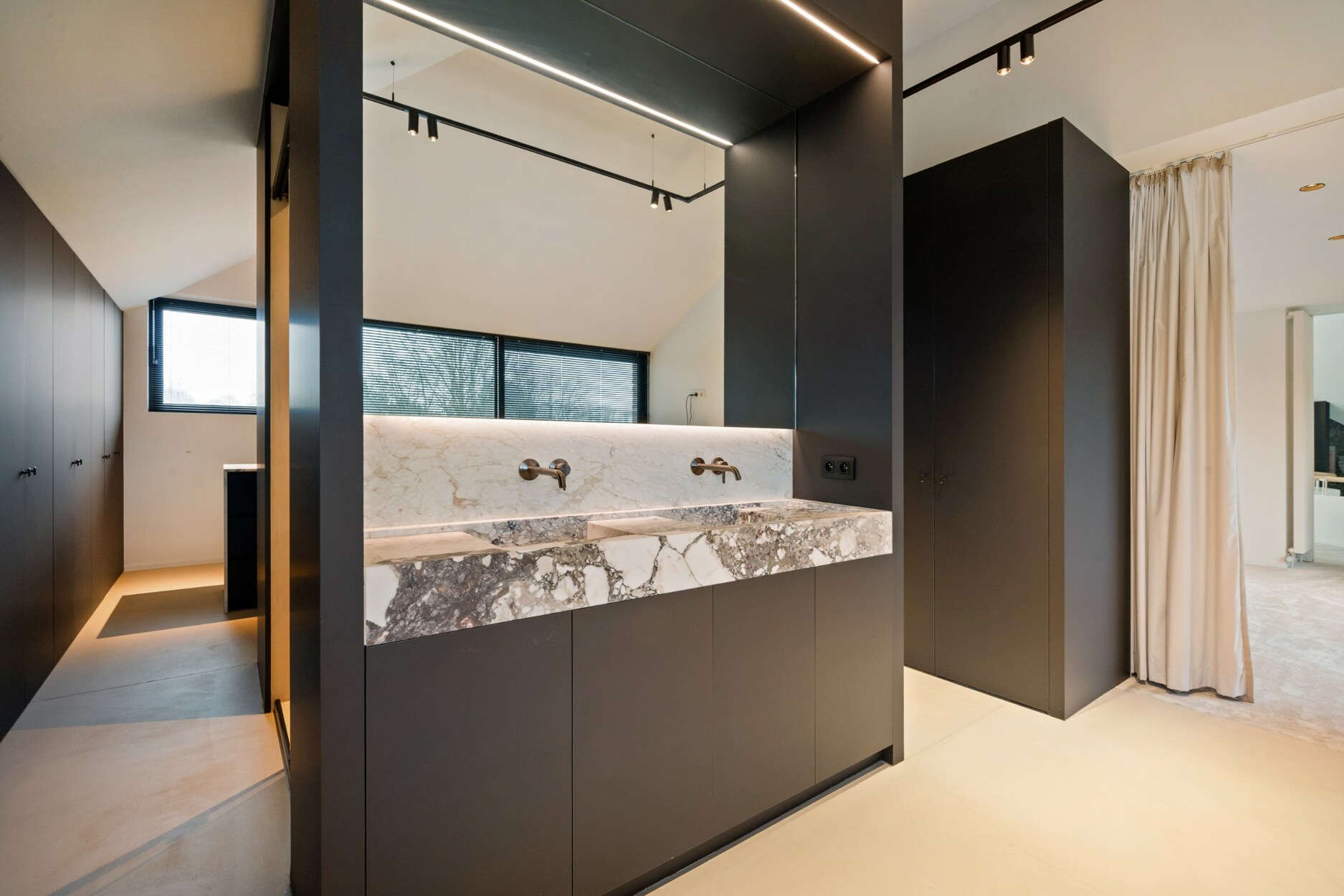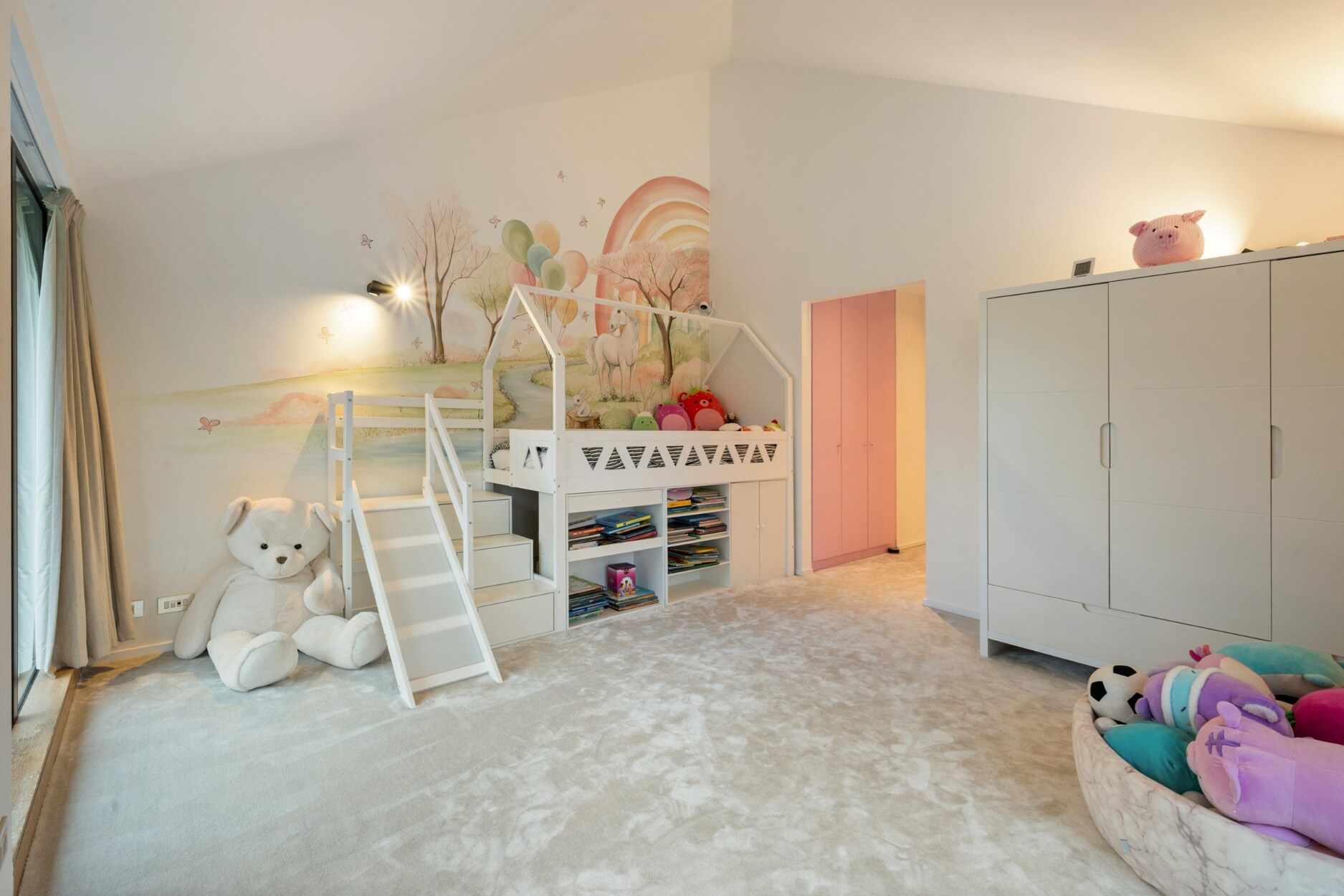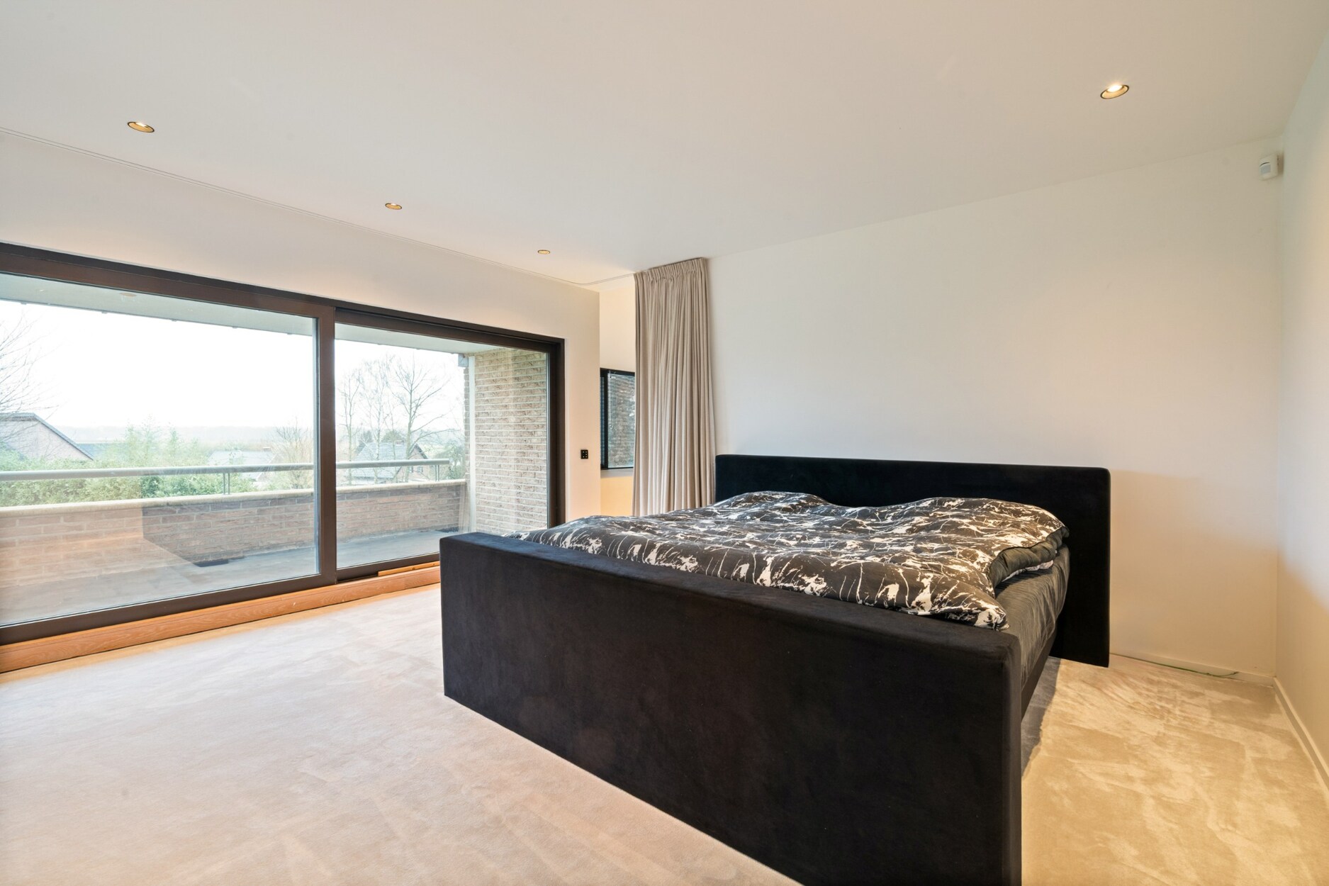 Op de verdieping bevindt zich het nachtgedeelte, bestaande uit een luxueuze master suite met dressing en ruime badkamer, aangevuld met meerdere bijkomende slaapkamers, diverse badkamers en een balkon met zicht op de tuin. Iedere kamer straalt rust en licht uit, met oog voor comfort en privacy.