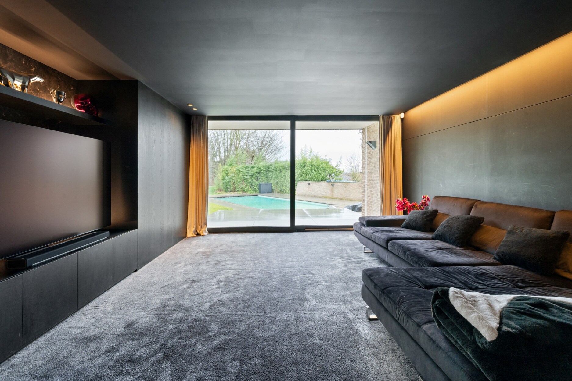Ook de kelderverdieping werd optimaal benut en ingedeeld tot een volwaardig ontspanningsniveau. U vindt er onder meer een volledig ingerichte cinemazaal, een fitnessruimte en verschillende opbergruimtes, wat talloze mogelijkheden biedt voor recreatie, wellness en hobby’s.