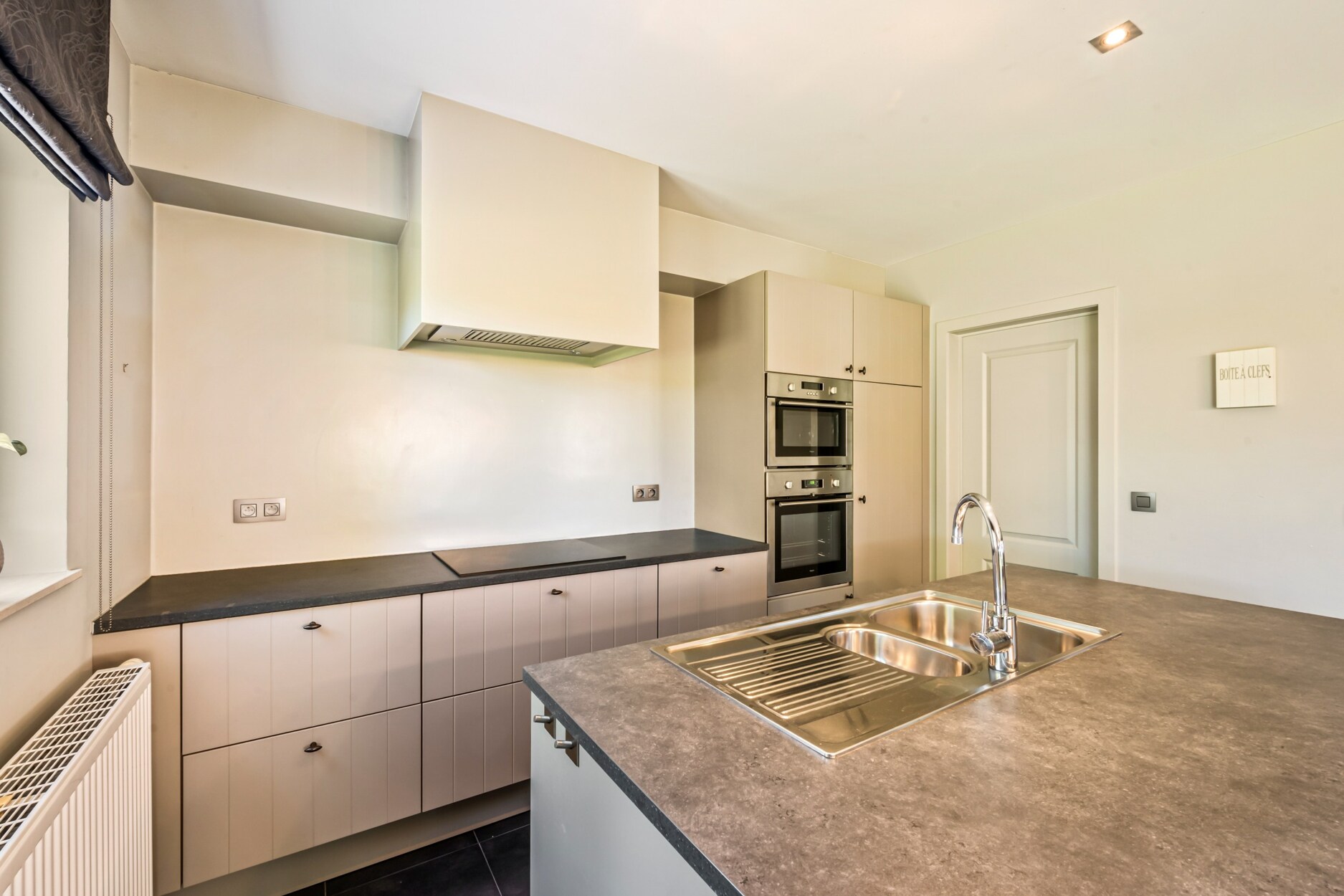 De woning beschikt over een lichtrijke woonkamer met parketvloer en een open keuken in landelijke stijl uitgerust met kookplaat, dampkap, vaatwas, oven, combi-oven en koelkast met vriesvak. Op het gelijkvloers bevinden zich daarnaast een apart bureel, een gastentoilet, een praktische berging en een garage met sectionaalpoort.