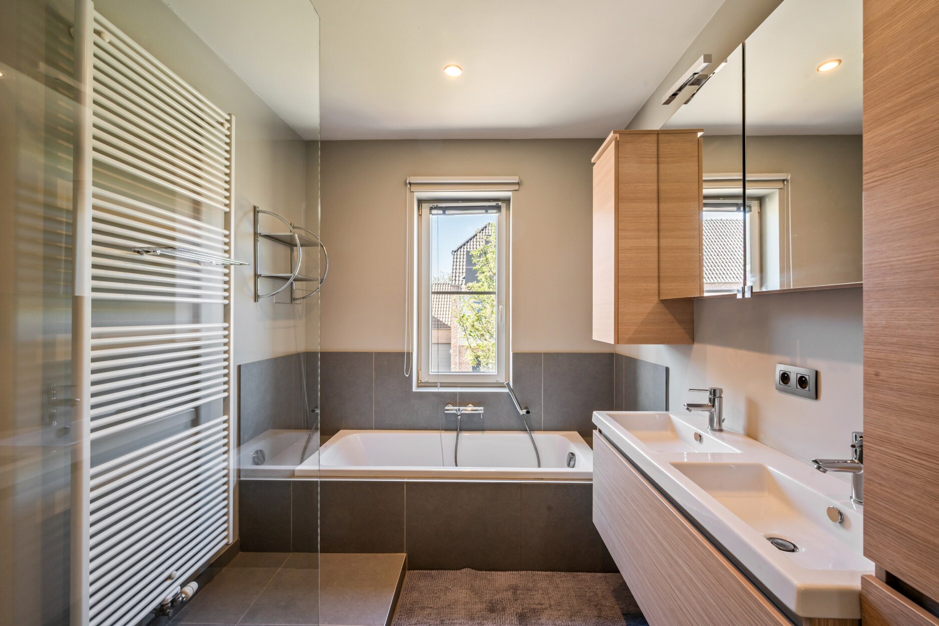 Via de houten trap bereikt u de eerste verdieping, waar zich vier slaapkamers, een apart toilet en een ruime badkamer bevinden. Deze is uitgerust met een ligbad, inloopdouche, sierradiator en een dubbel badkamermeubel.