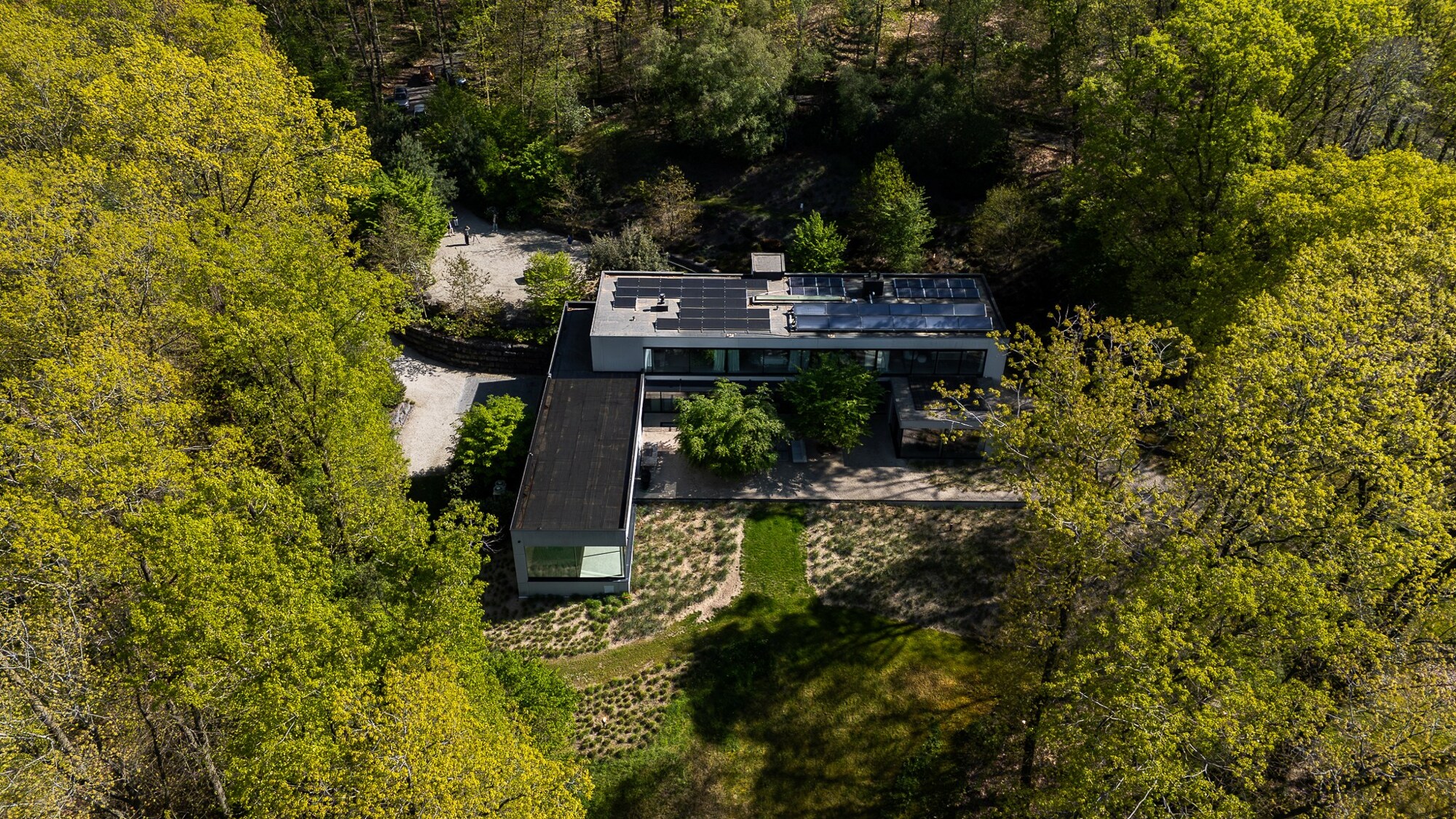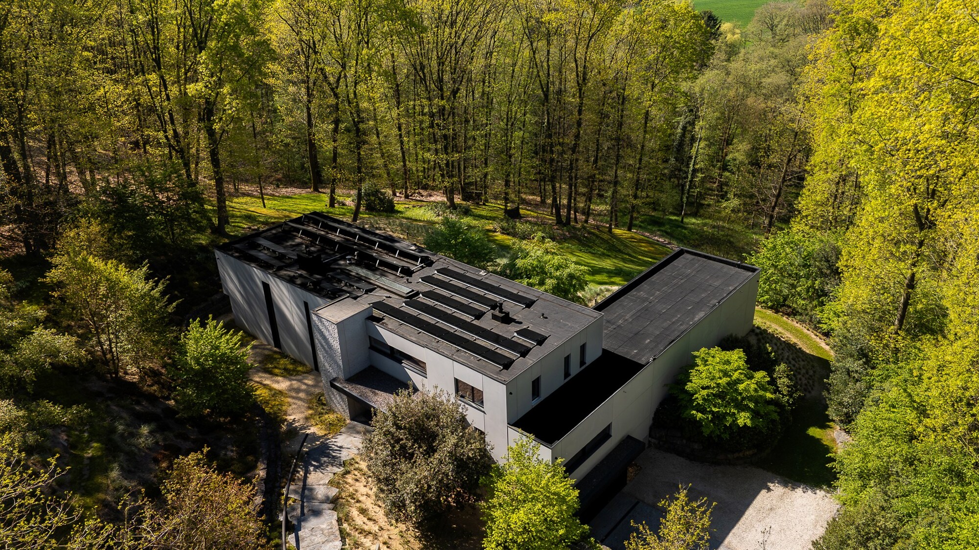 Gelegen in de gewilde wijk Caturia in Lasne, ontwikkelt deze eigentijdse villa een bruto oppervlakte van ± 800 m² (EPB B) en ligt op een aangelegd terrein van ± 1,56 hectare, gedeeltelijk bebost en ontworpen door landschapsarchitect Delvosalle.