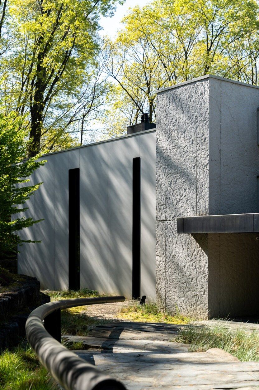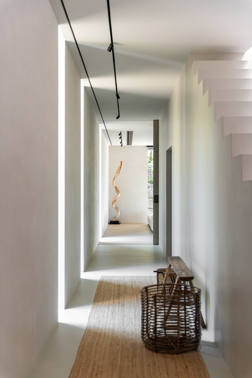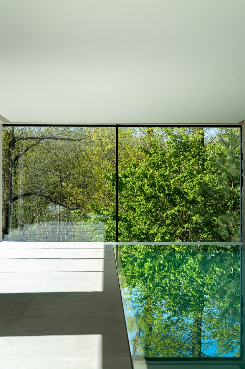 De wellnessruimte omvat een binnenzwembad omgeven door natuursteen, een fitnessruimte, een thuisbioscoop en een atelier.