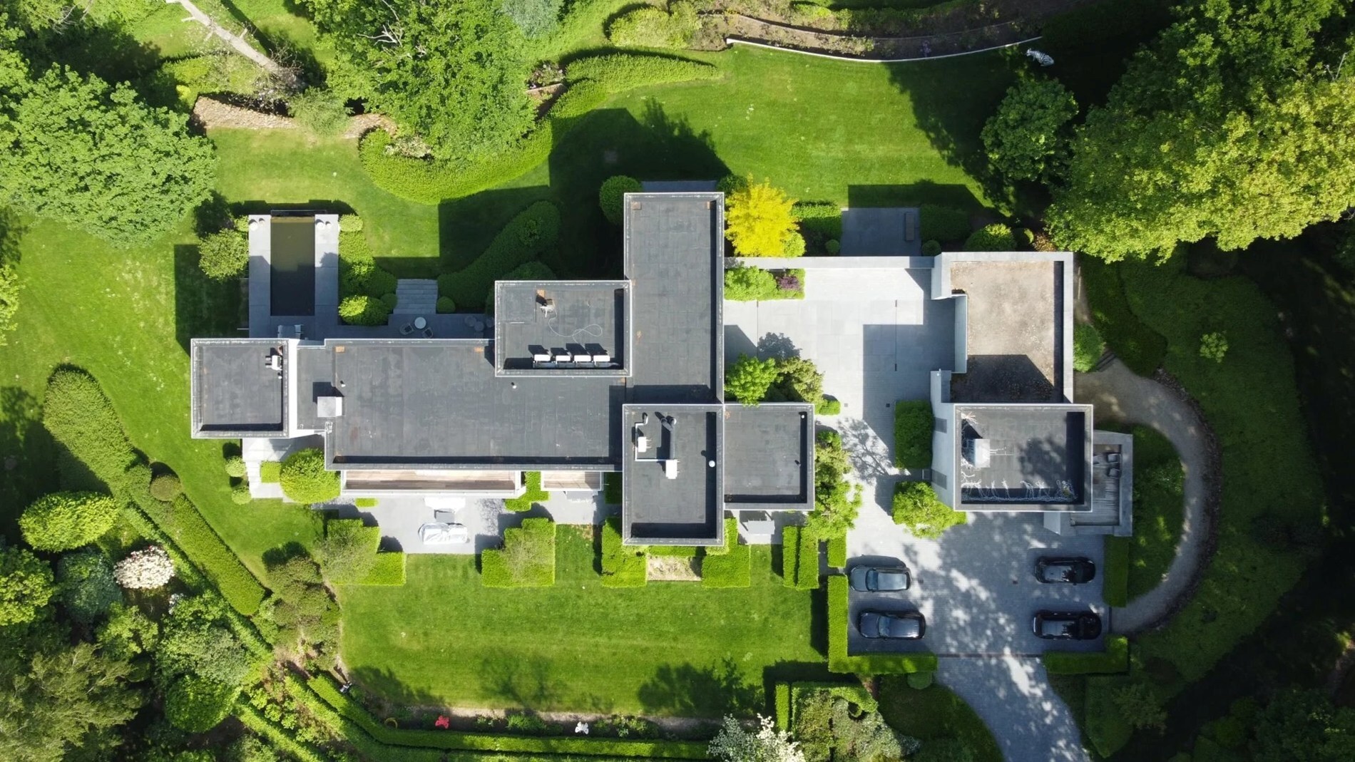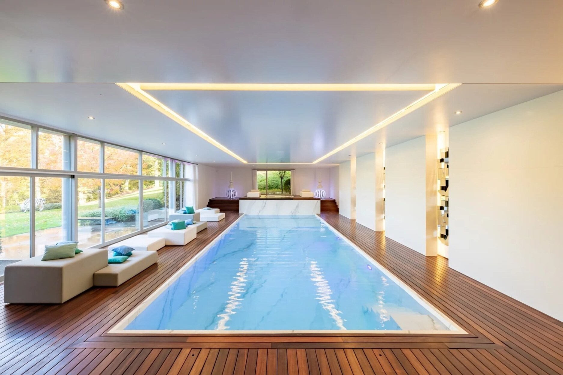 Het lagere niveau herbergt een complete ontspanningsruimte: binnenzwembad, jacuzzi, bargedeelte, fitnessruimte, kleedkamers met douches en toiletten, wasruimte, diverse kelders en technische ruimtes. Een apart conciërgewoning, een garage voor ± 7 voertuigen en meerdere goed georiënteerde terrassen maken het geheel compleet.