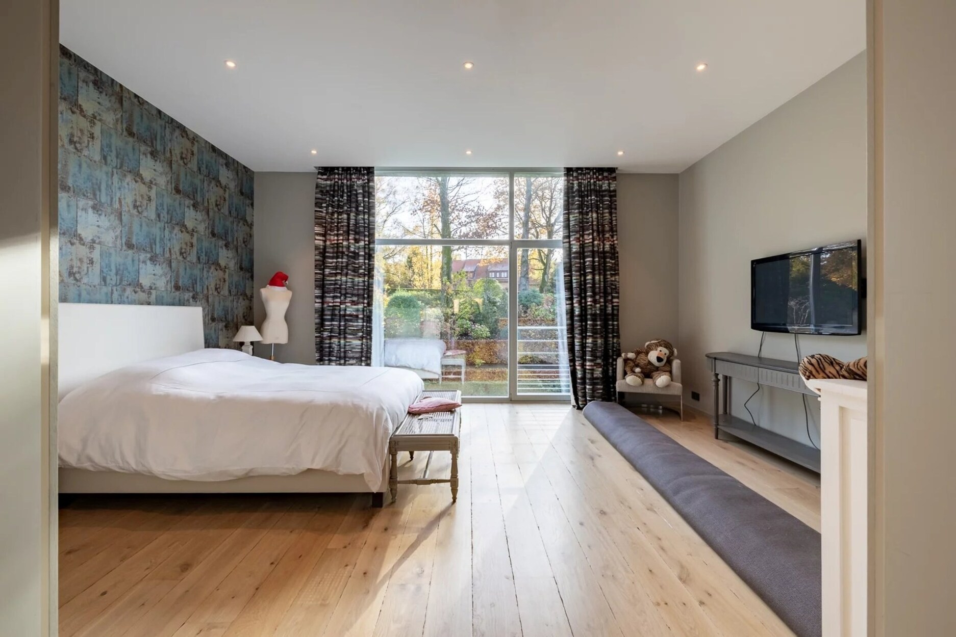 De begane grond is opgezet rond een ruime inkomhal met vestiaire en gastentoilet, een dubbele woonkamer, een eetkamer, een tv-kamer, een kantoor, een ingerichte keuken met ontbijtruimte, een bijkeuken en een tweede toilet. Op de bovenverdieping omvat de ouderlijke suite een dubbele slaapruimte, een privé zitkamer, een dressing en een dubbele badkamer met toilet. Vier extra slaapkamers met eigen badkamer completeren deze verdieping, elk met een doucheruimte en toilet.