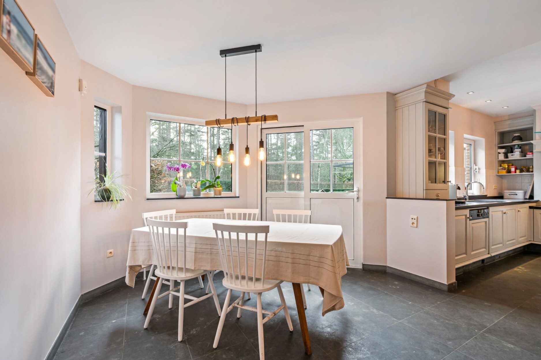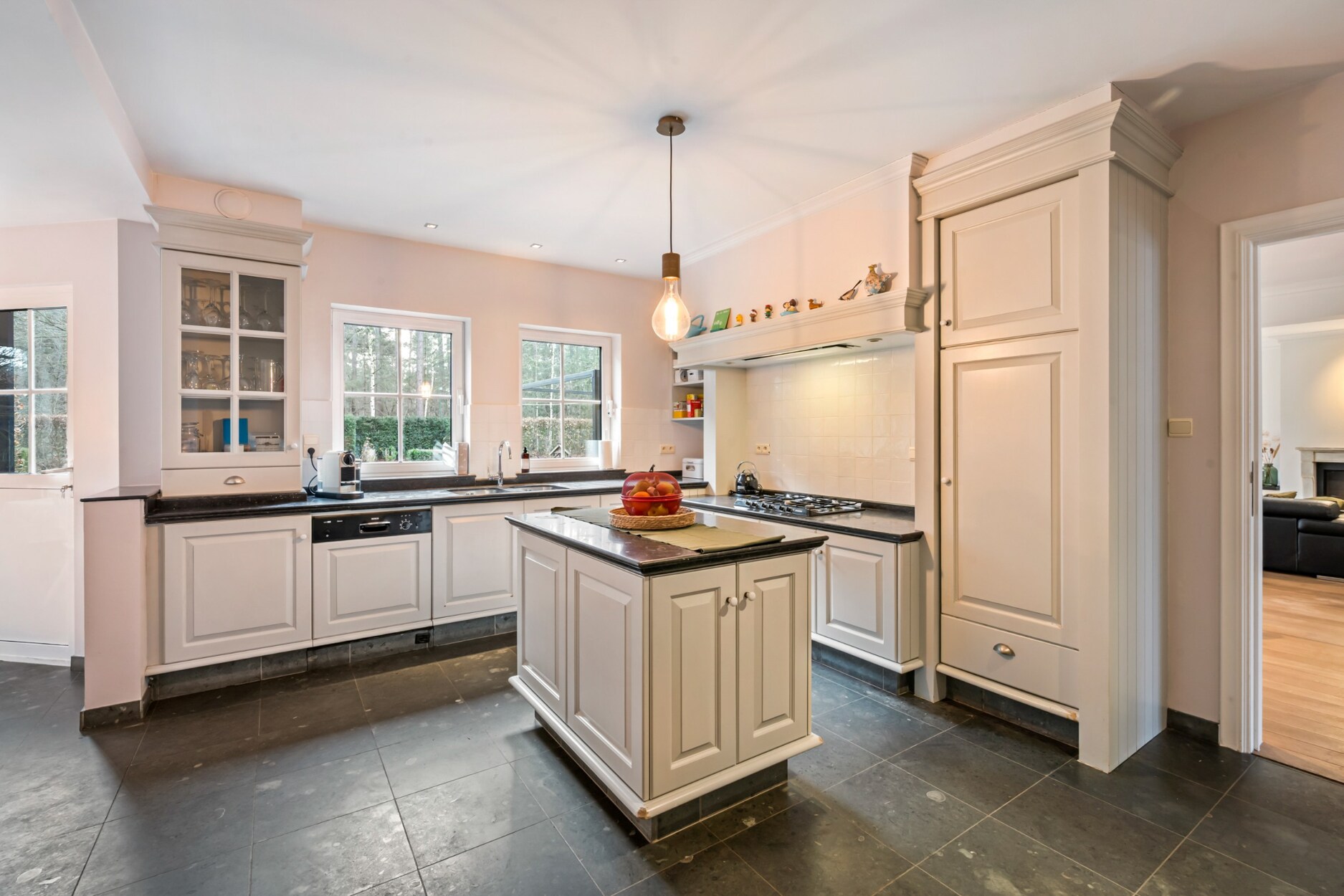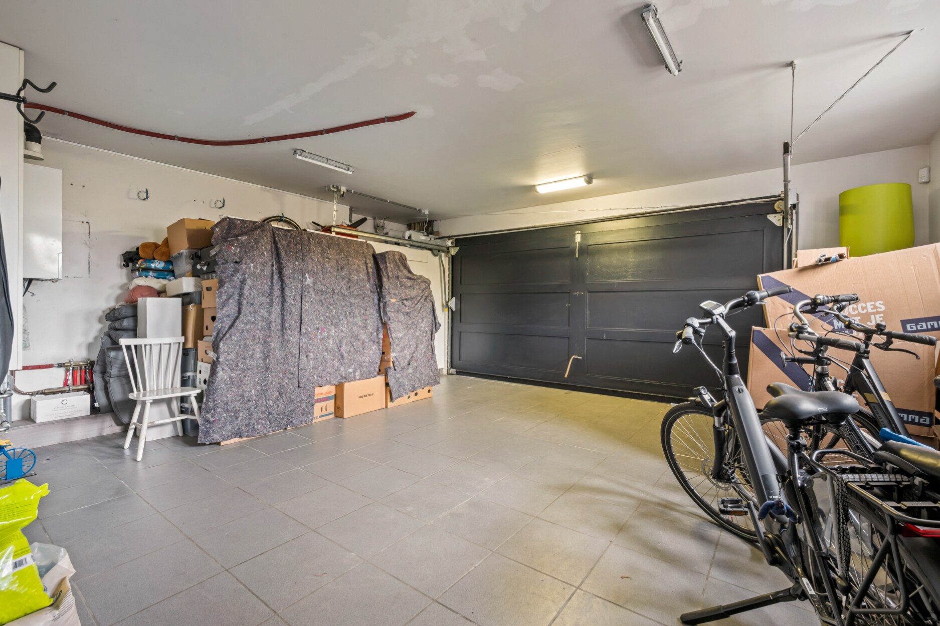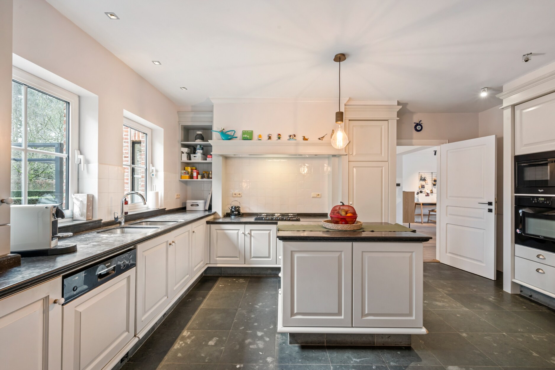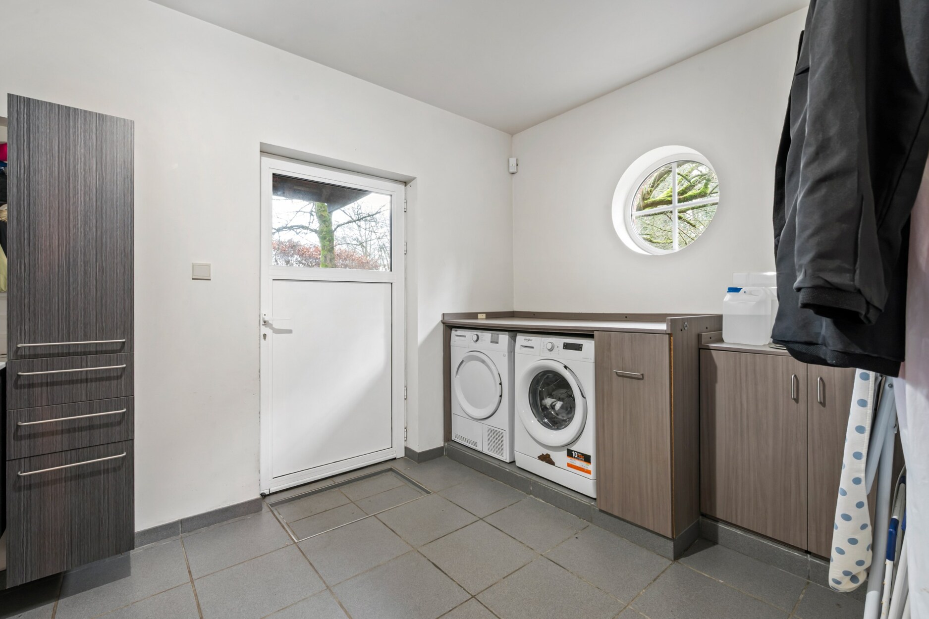 Royale inkomhal op natuurstenen vloer met gastentoilet. De woonkamer op massief eiken parket omvat een gezellige zithoek met gashaard en een aansluitende eetkamer. Af te sluiten bureauruimte op parket te bereiken vanuit de woonkamer. De landelijke leefkeuken met ontbijthoek en toegang tot het terras is compleet ingericht met apparatuur (vaatwasser, gaskookplaat, microgolfoven, heteluchtoven). Voorraadberging aanpalend de keuken aanwezig. De praktische wasplaats met zij-inkom is voorzien van ingemaakte kasten, spoelbak en aansluiting voor een wasmachine. De inpandige garage met plaats voor 2 wagens is voorzien van een automatische poort. Alle leefruimtes bieden een mooi uitzicht op de tuin en het achterliggende bosgebied.