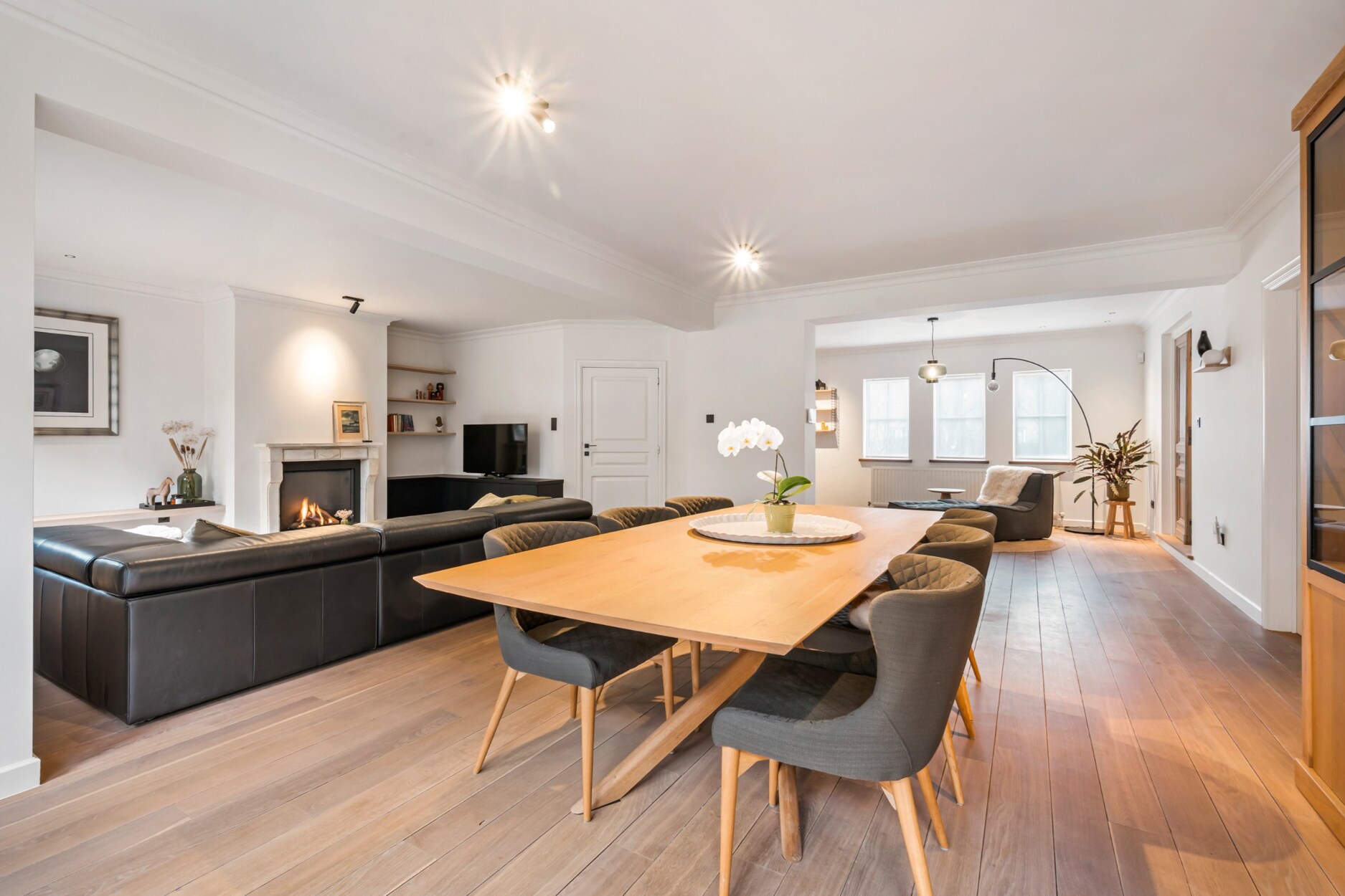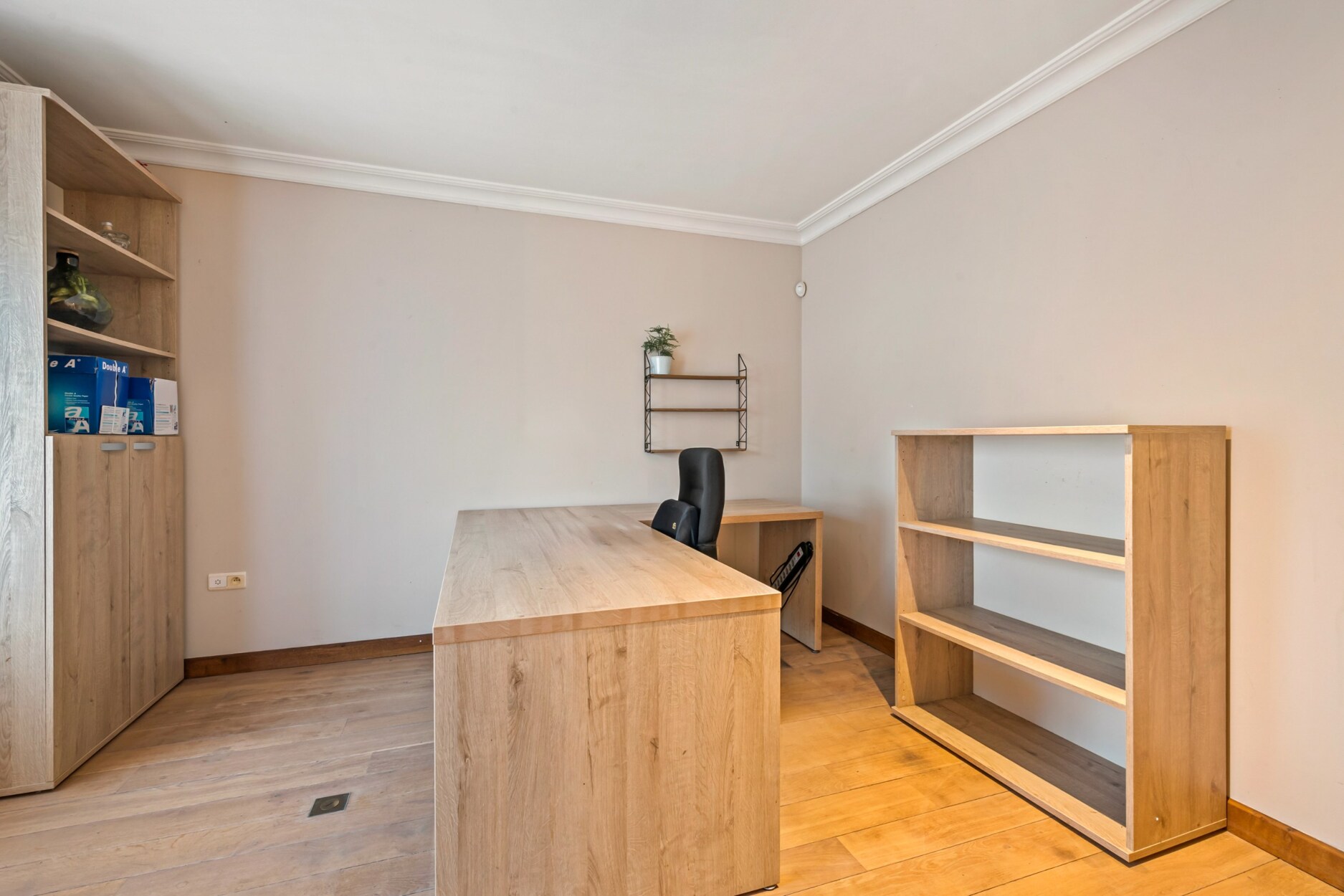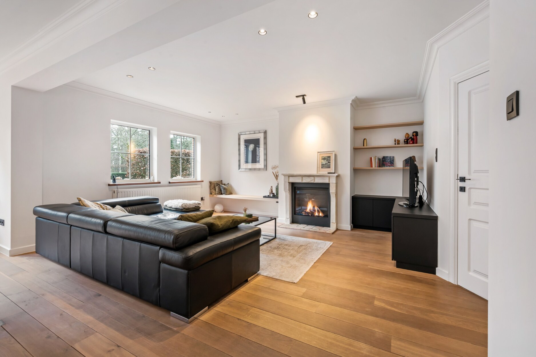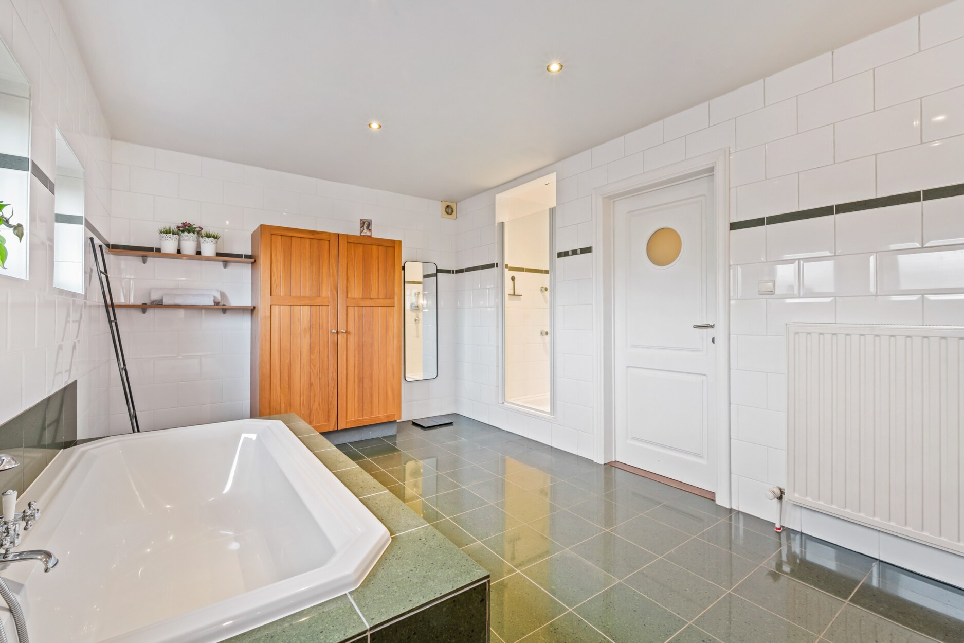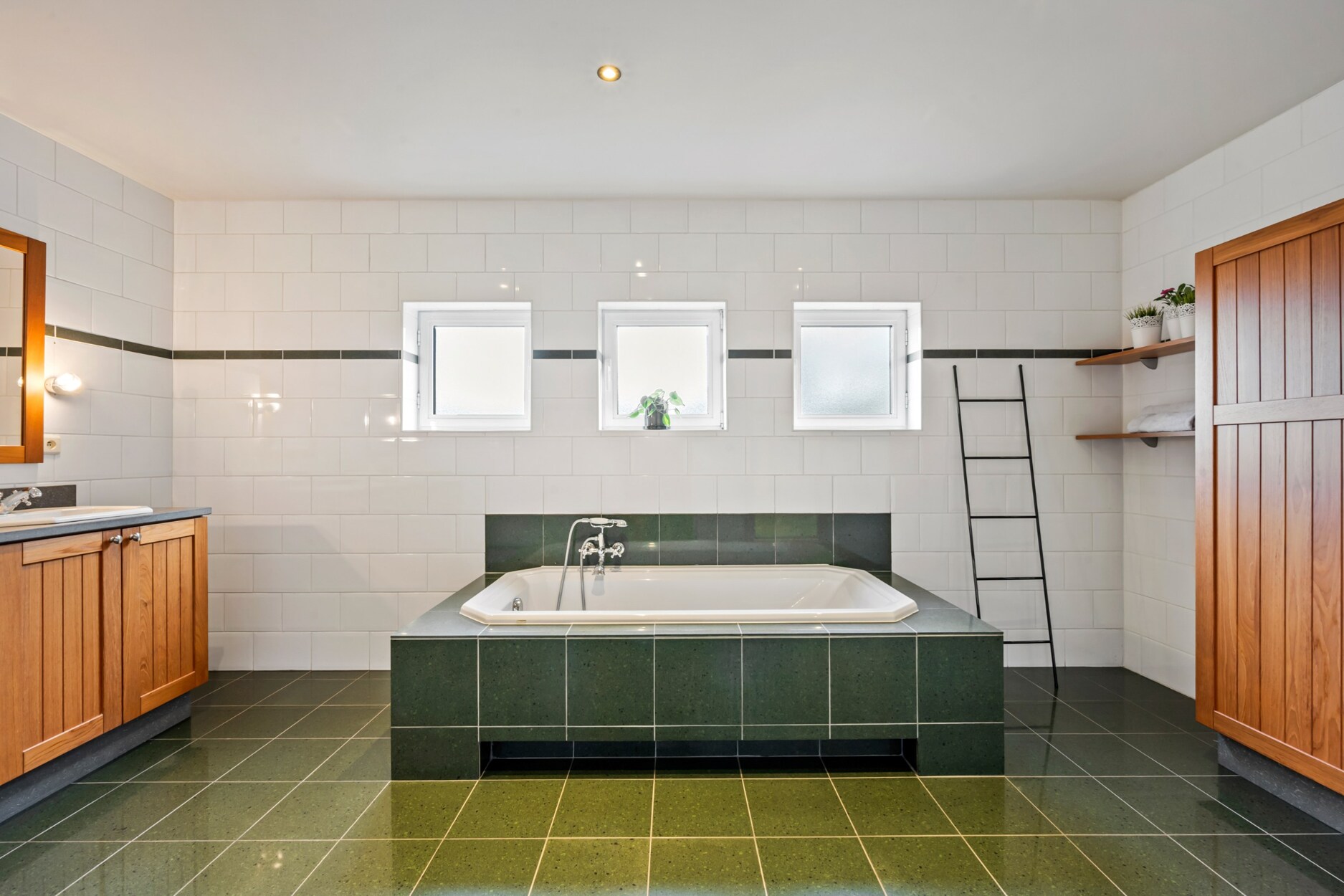 Royale inkomhal op natuurstenen vloer met gastentoilet. De woonkamer op massief eiken parket omvat een gezellige zithoek met gashaard en een aansluitende eetkamer. Af te sluiten bureauruimte op parket te bereiken vanuit de woonkamer. De landelijke leefkeuken met ontbijthoek en toegang tot het terras is compleet ingericht met apparatuur (vaatwasser, gaskookplaat, microgolfoven, heteluchtoven). Voorraadberging aanpalend de keuken aanwezig. De praktische wasplaats met zij-inkom is voorzien van ingemaakte kasten, spoelbak en aansluiting voor een wasmachine. De inpandige garage met plaats voor 2 wagens is voorzien van een automatische poort. Alle leefruimtes bieden een mooi uitzicht op de tuin en het achterliggende bosgebied.
