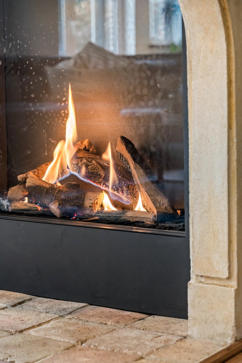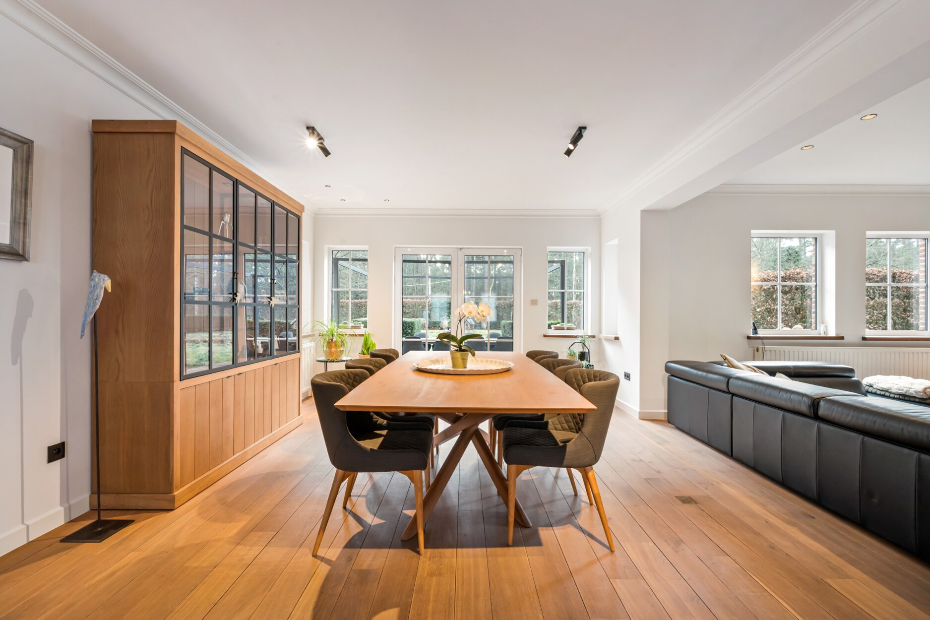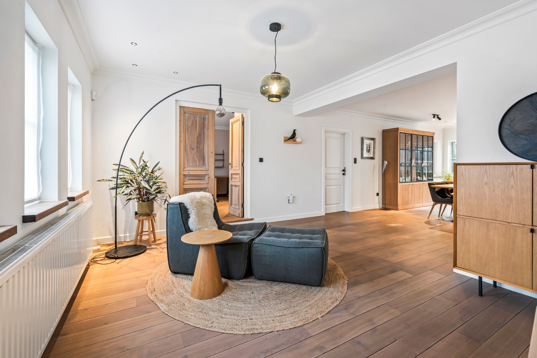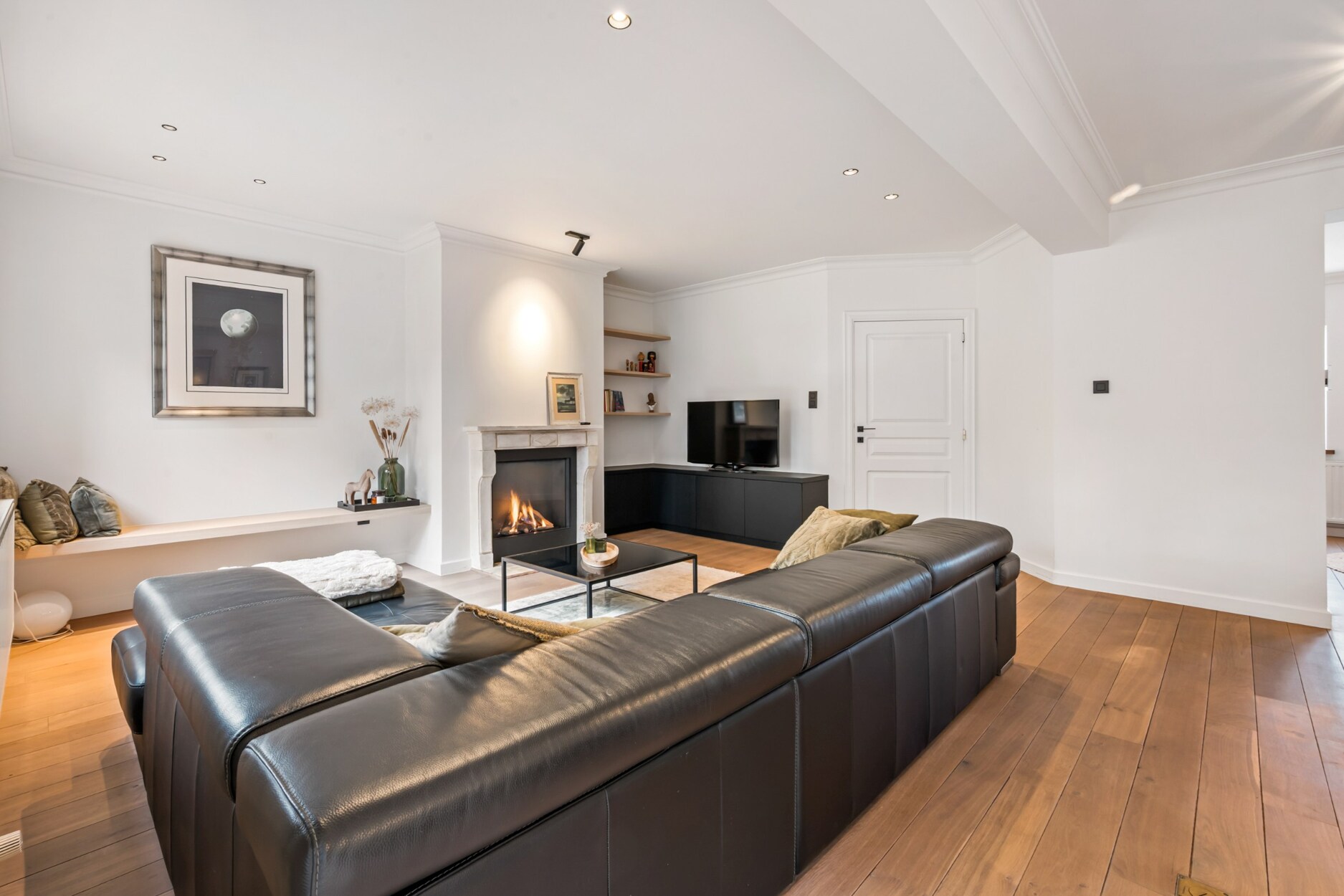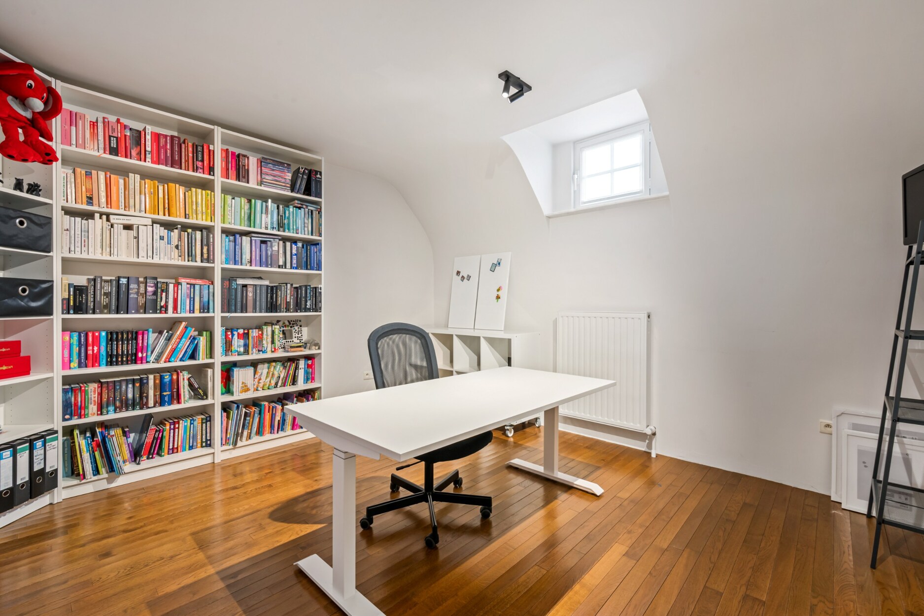 Royale inkomhal op natuurstenen vloer met gastentoilet. De woonkamer op massief eiken parket omvat een gezellige zithoek met gashaard en een aansluitende eetkamer. Af te sluiten bureauruimte op parket te bereiken vanuit de woonkamer. De landelijke leefkeuken met ontbijthoek en toegang tot het terras is compleet ingericht met apparatuur (vaatwasser, gaskookplaat, microgolfoven, heteluchtoven). Voorraadberging aanpalend de keuken aanwezig. De praktische wasplaats met zij-inkom is voorzien van ingemaakte kasten, spoelbak en aansluiting voor een wasmachine. De inpandige garage met plaats voor 2 wagens is voorzien van een automatische poort. Alle leefruimtes bieden een mooi uitzicht op de tuin en het achterliggende bosgebied.