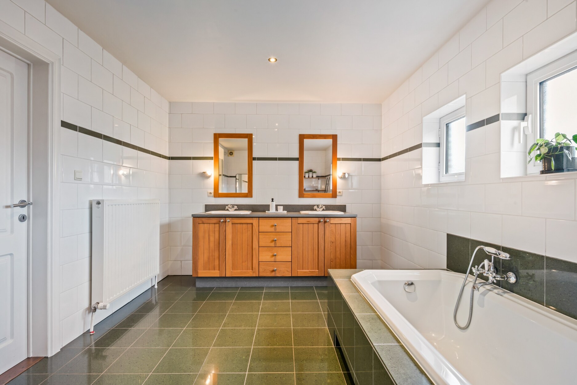 De badkamer is uitgerust met ligbad, douche en dubbele lavabo in een stijlvol meubel.