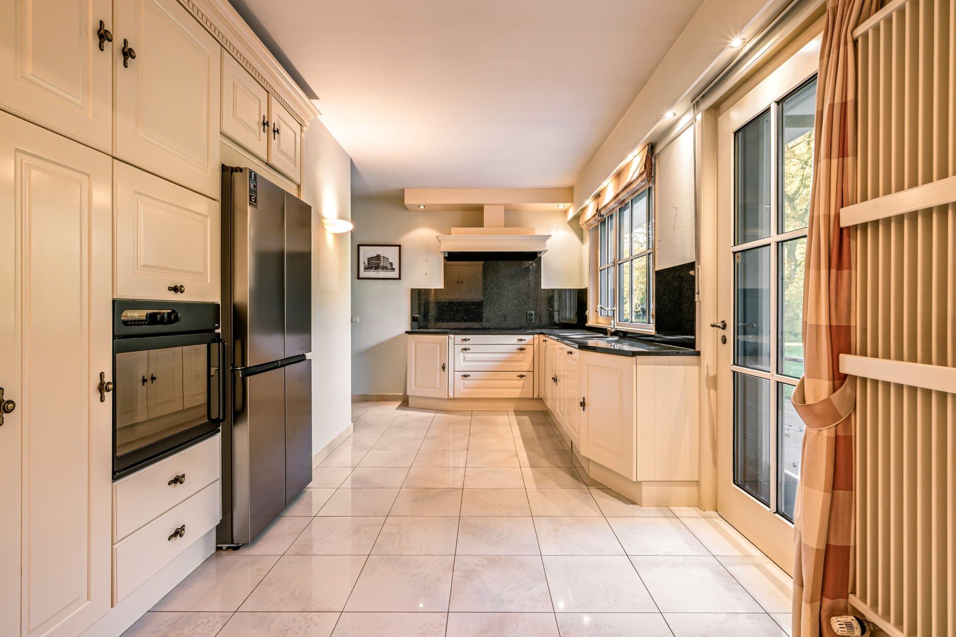 De volledig uitgeruste keuken biedt eveneens zicht op en directe toegang tot het terras en wordt vergezeld door een praktische berging. Aansluitend bevindt zich een tweede gezellige leef- en eetruimte, voorzien van een houtkachel, wat deze ruimte bijzonder warm en uitnodigend maakt. Tevens is er een aparte bureauruimte, ideaal voor wie praktijk- of kantooractiviteiten aan huis wenst. De inpandige garage met automatische poort biedt plaats aan twee voertuigen.