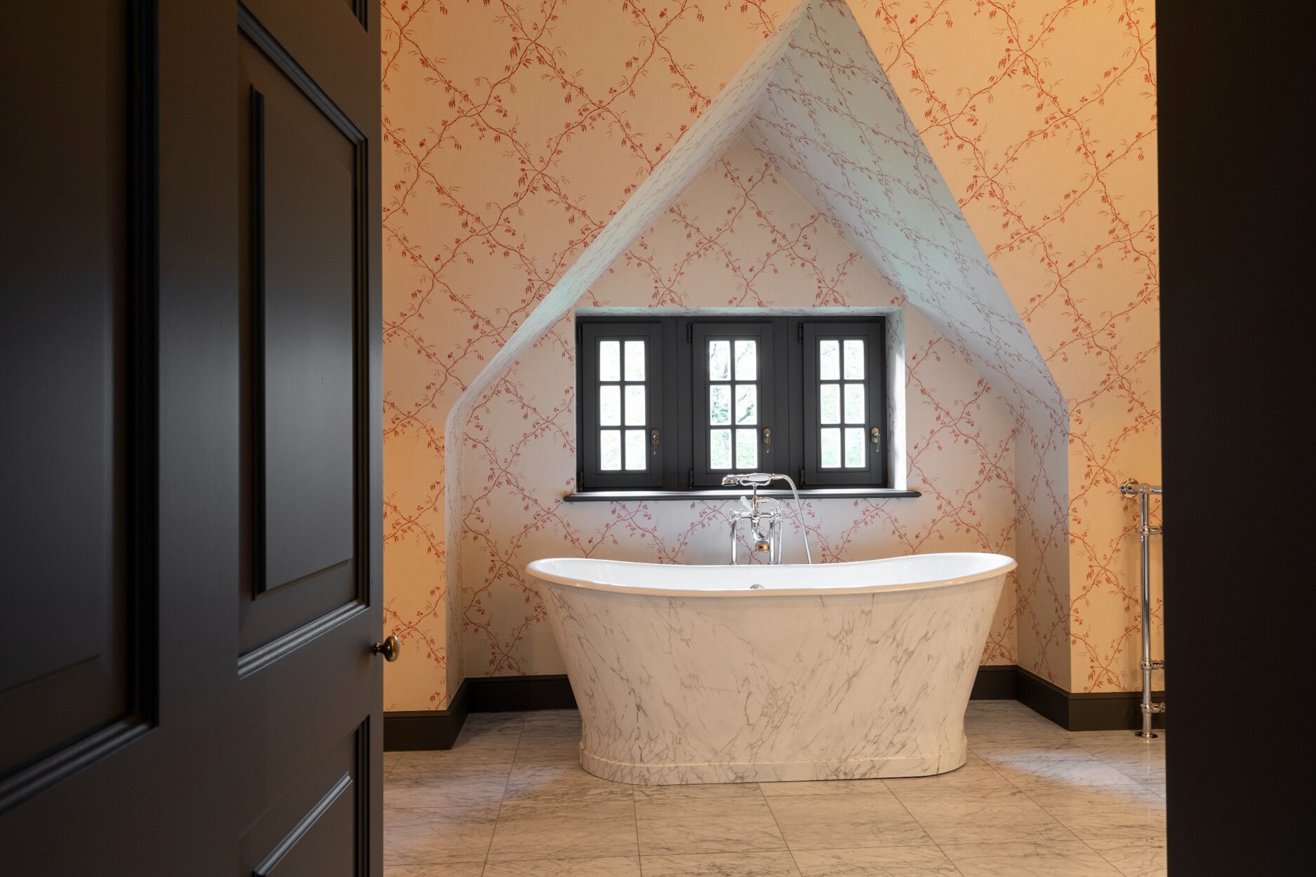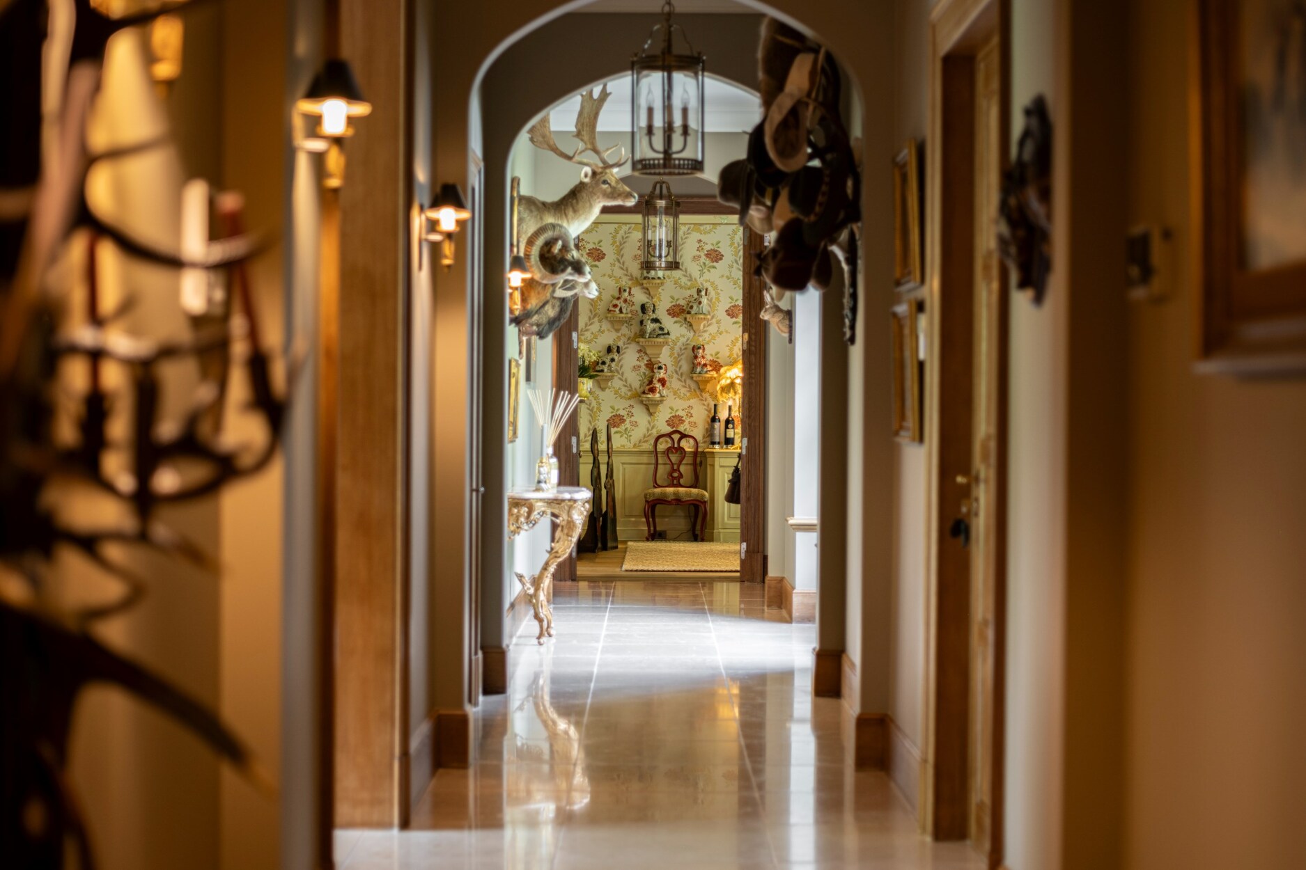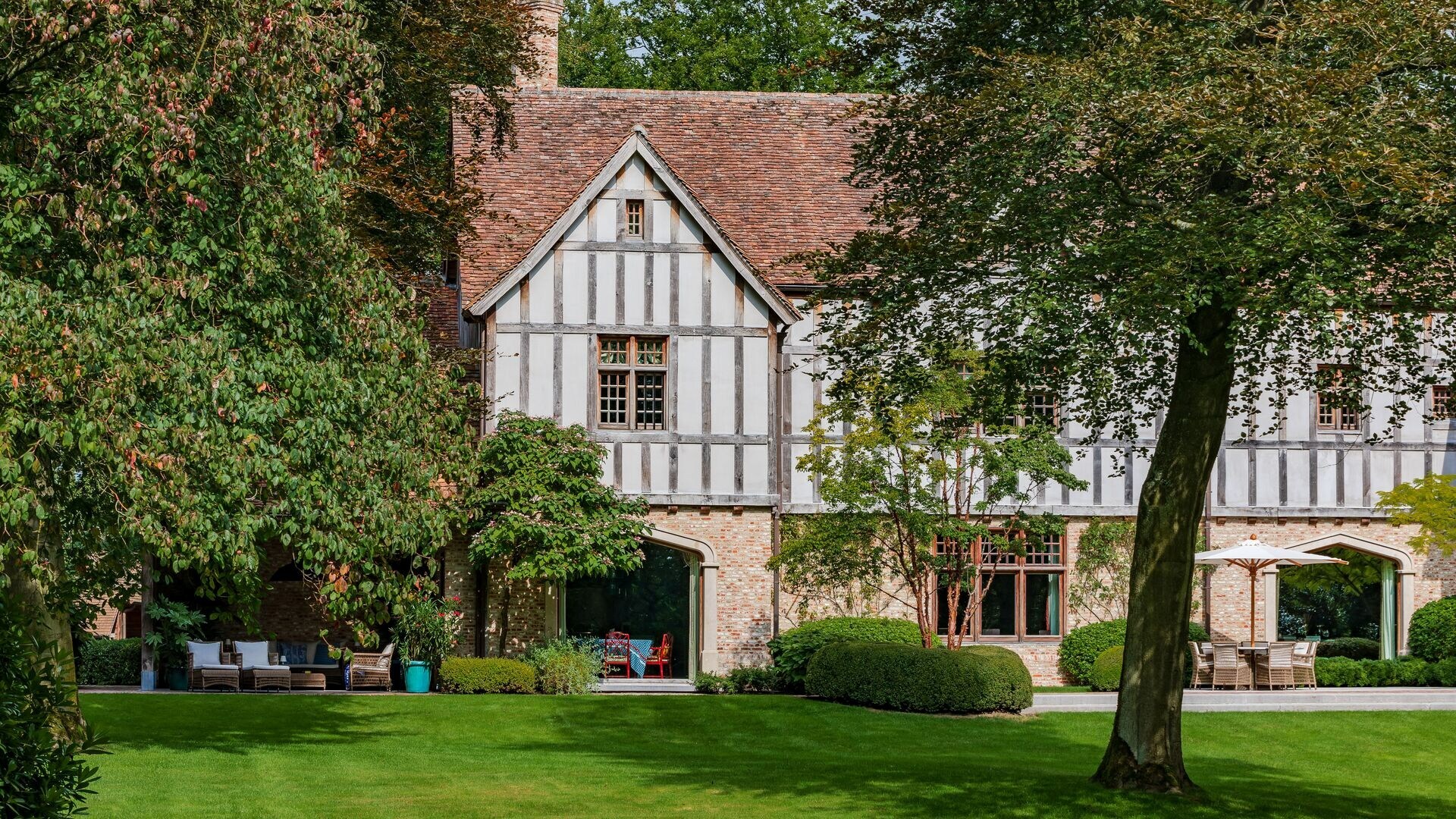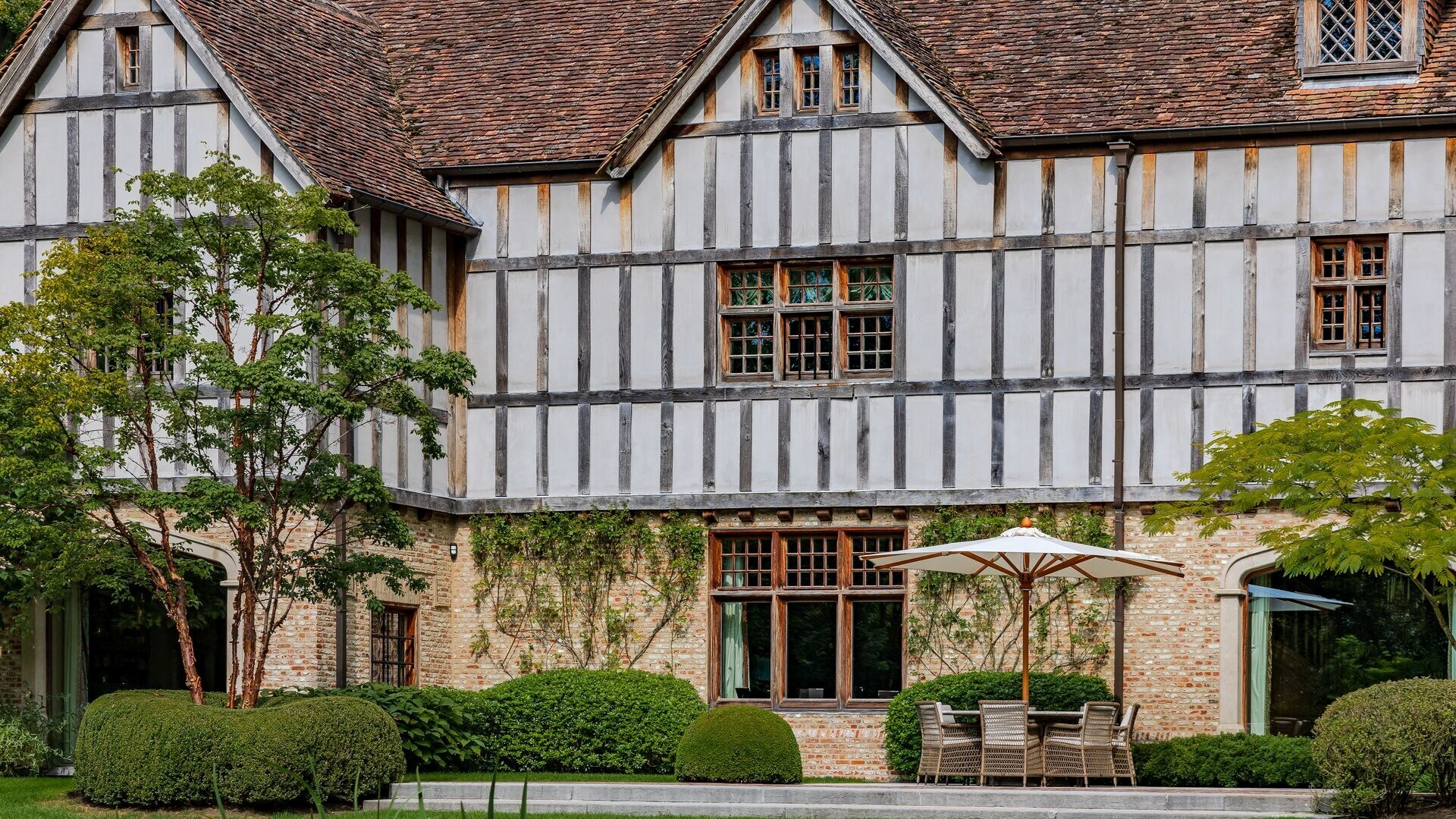 Van zodra we de majestueuze inkomhal betreden, hebben we een doorkijk en prachtig zicht op de aangelegde tuin via het grote raam, voorzien van Tudor-punt.