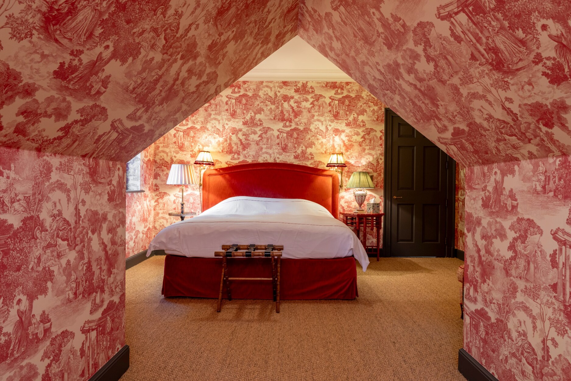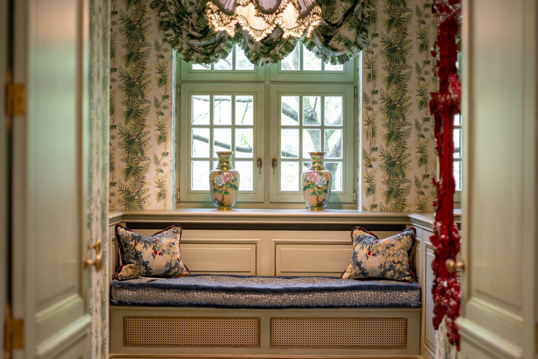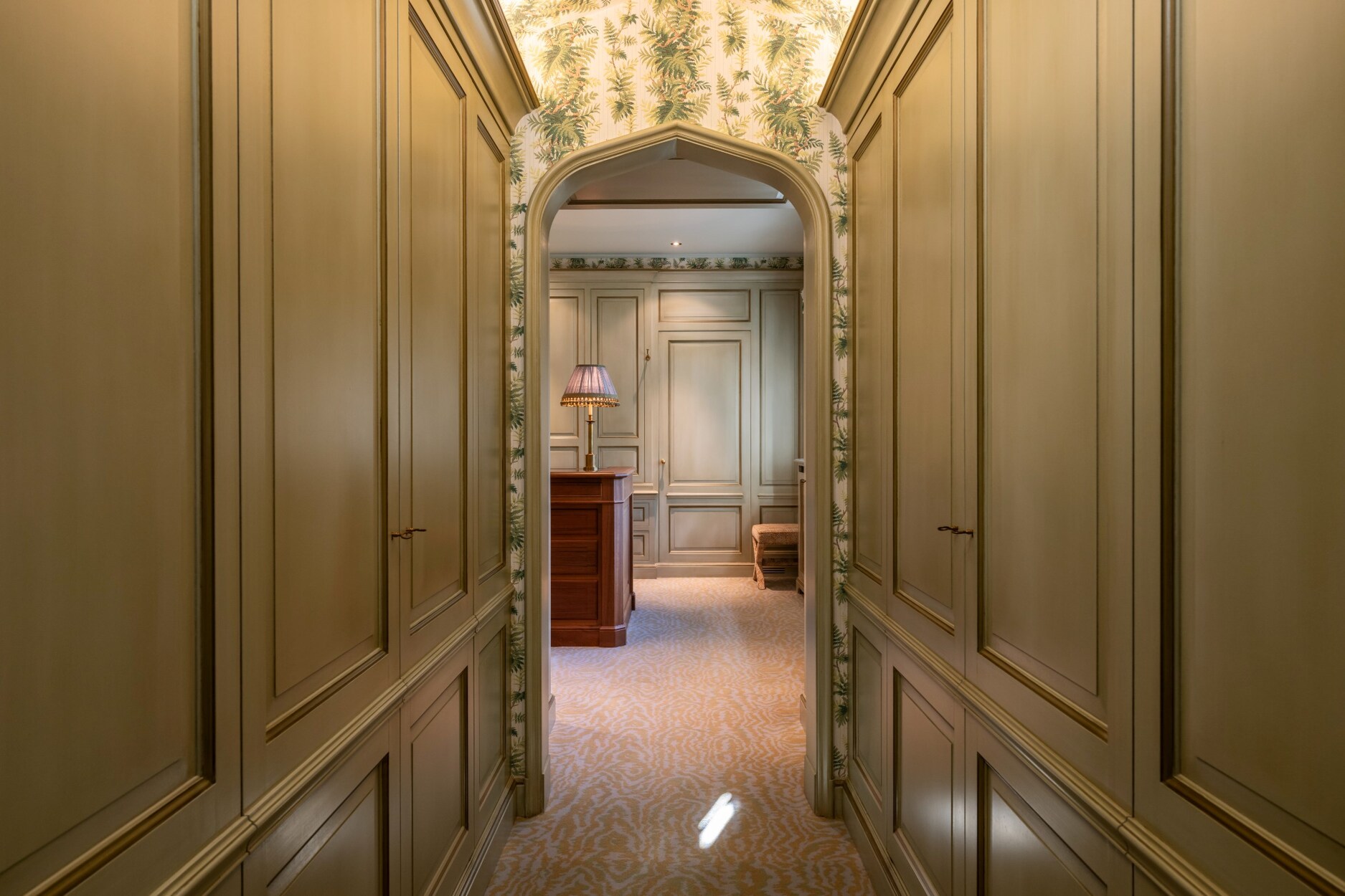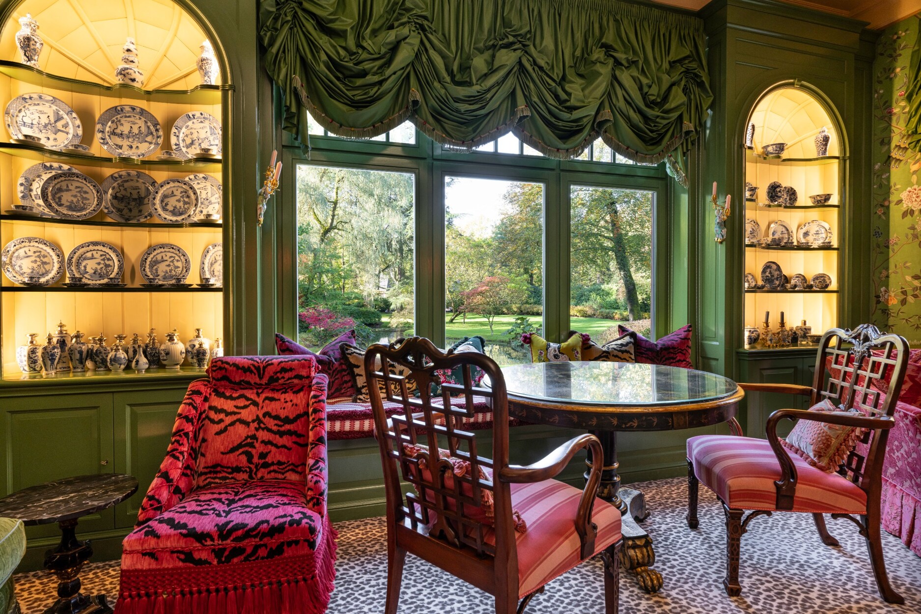Vele kamers werden afwerkt met mooie passende lambrisering en “De Gournay” -behangpapier. Dit handgeschilderd behangpapier is werkelijk uniek.