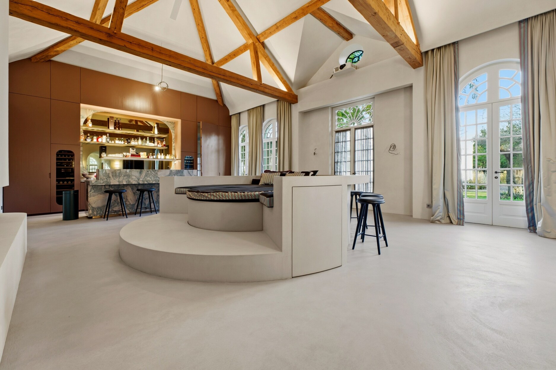 Vanuit de hoofdbouw bereikt men de indrukwekkende leisure-vleugel. De ruime bar en lounge met monumentale houten spanten, hoge plafonds en sculpturale, afgeronde natuurstenen bar doet denken aan een private members club. Maatwerkkasten, verlichte schappen en een wijnklimaatkast versterken de exclusieve uitstraling.