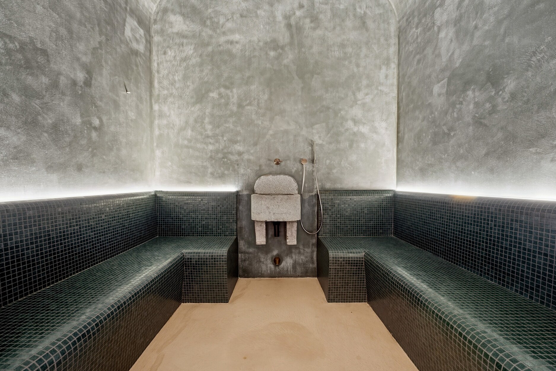 Aansluitend bevindt zich de luxueuze wellness, bestaande uit een authentieke hamam in mozaïek en microtopping, en een stijlvolle sauna in donker thermowood met boogramen die uitkijken op de tuin. Deze ruimte creëert een serene spa-beleving binnen eigen huis.