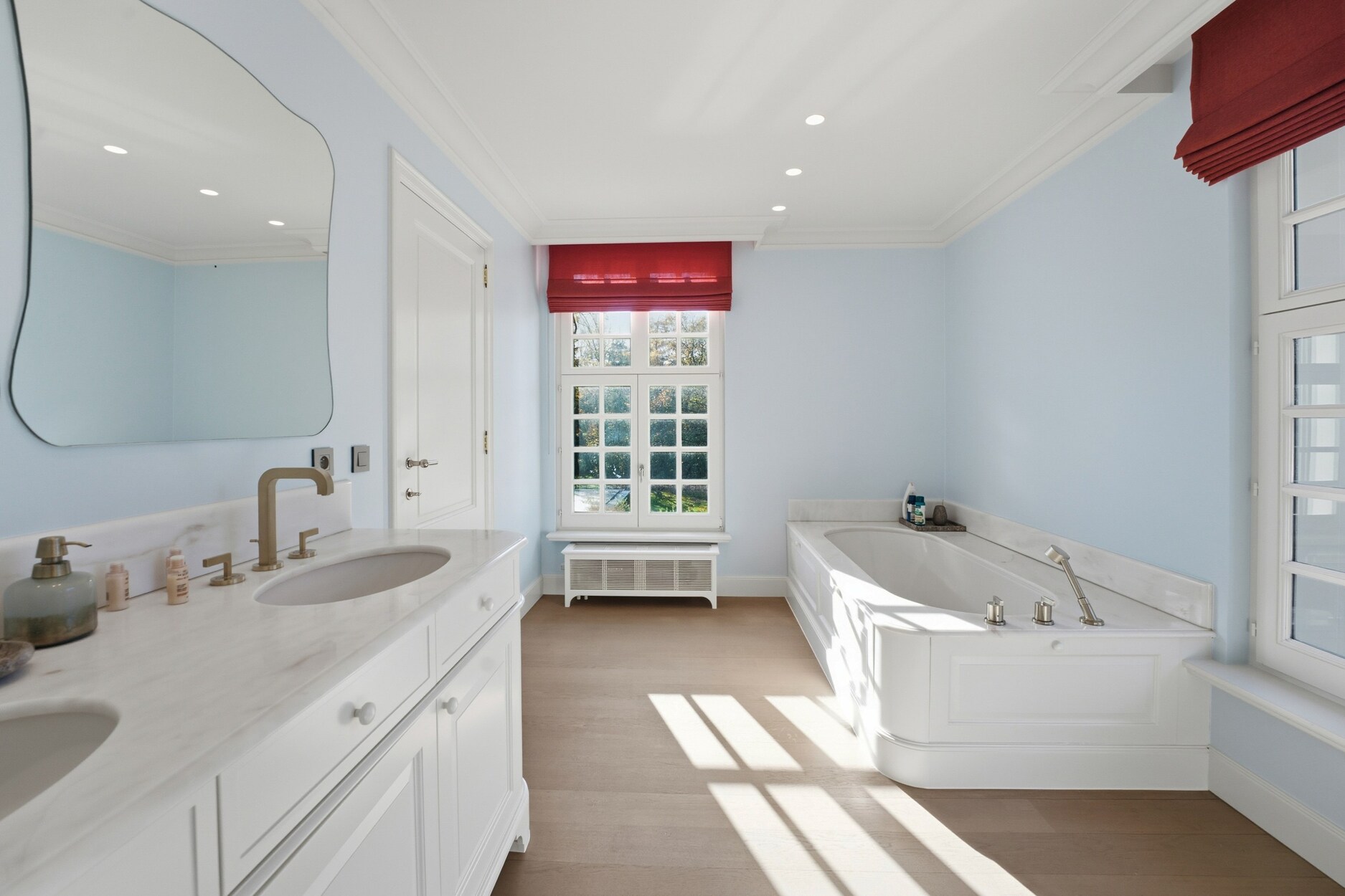 De master suite omvat een ruime slaapkamer met visgraatparket, maatwerkkasten en een indrukwekkende op maat gemaakte dressing met decoratieve grafische panelen. De ensuite badkamer is een absolute eyecatcher, uitgevoerd in rijk marmer en voorzien van een vrijstaand bad, dubbele wastafel, grote spiegels, luxe armaturen en ramen met zicht op het groen.