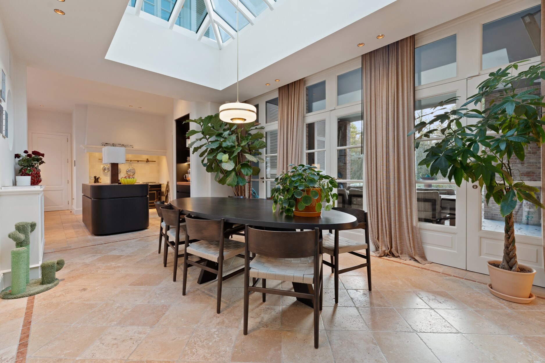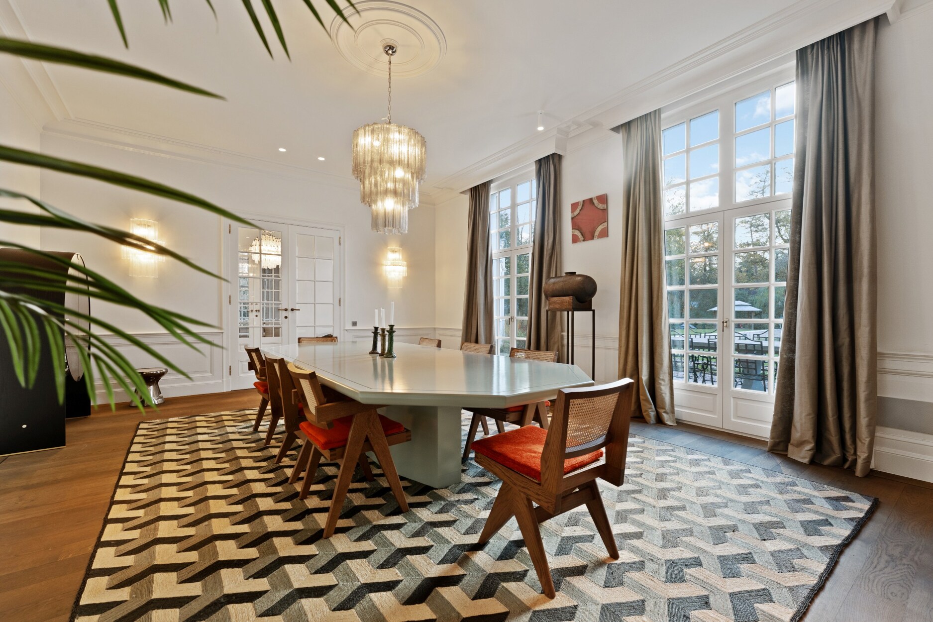 De formele eetkamer straalt grandeur uit met haar hoge plafonds, moulures, dubbele deuren en grote ramen met zicht op de tuin. Aansluitend bevindt zich het stijlvolle salon met brede houten vloeren, verfijnde raambekleding en een indrukwekkende natuurstenen schouwmantel. De aangrenzende muziekkamer met grote erker en vleugelpiano vormt een aparte, lichtrijke zithoek.