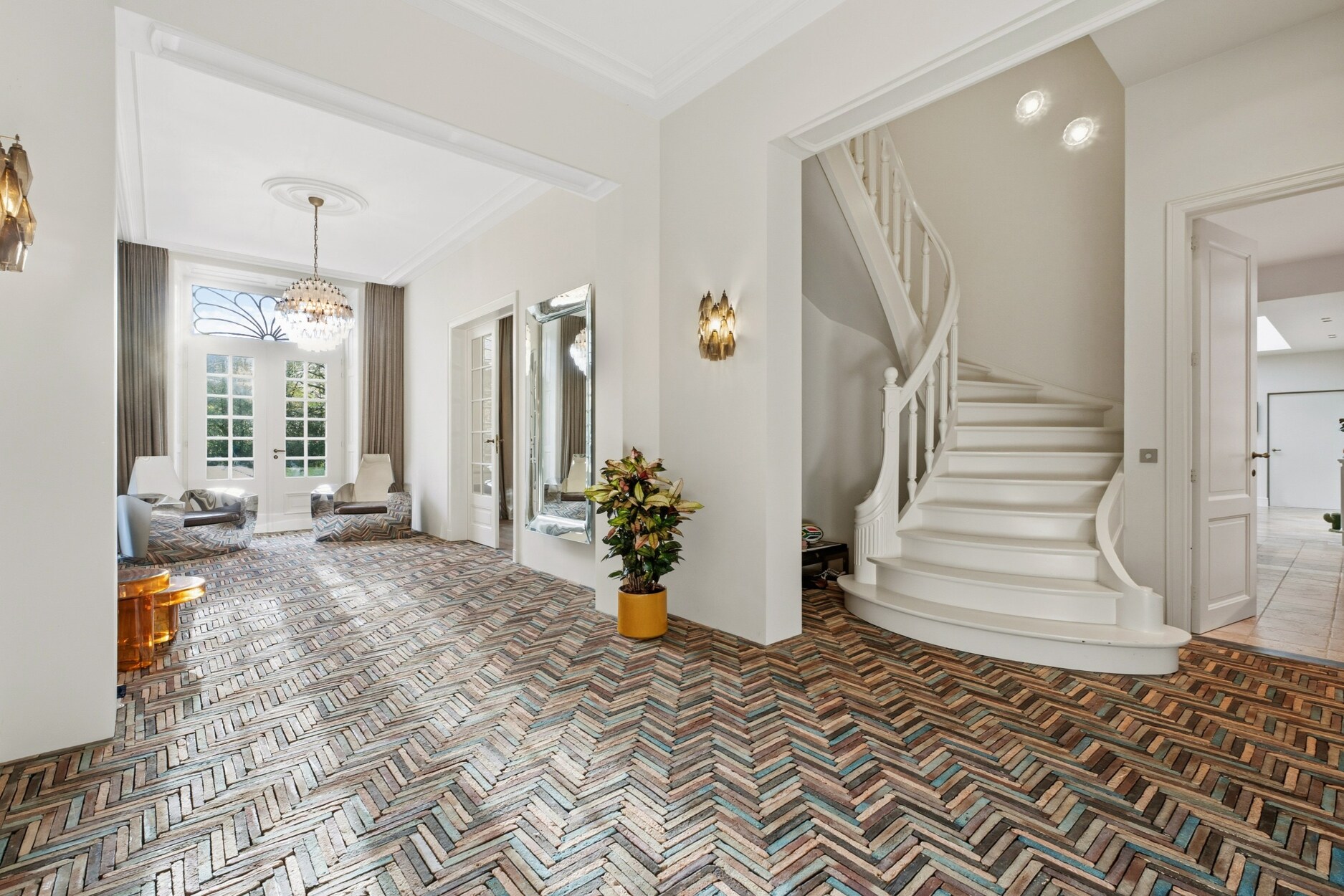 Via de statige inkomhal met unieke visgraatvloer en elegante witgelakte trap betreden we de woning. De hal geniet van prachtige lichtinval dankzij de hoge raampartijen en vormt de centrale as van het huis.
