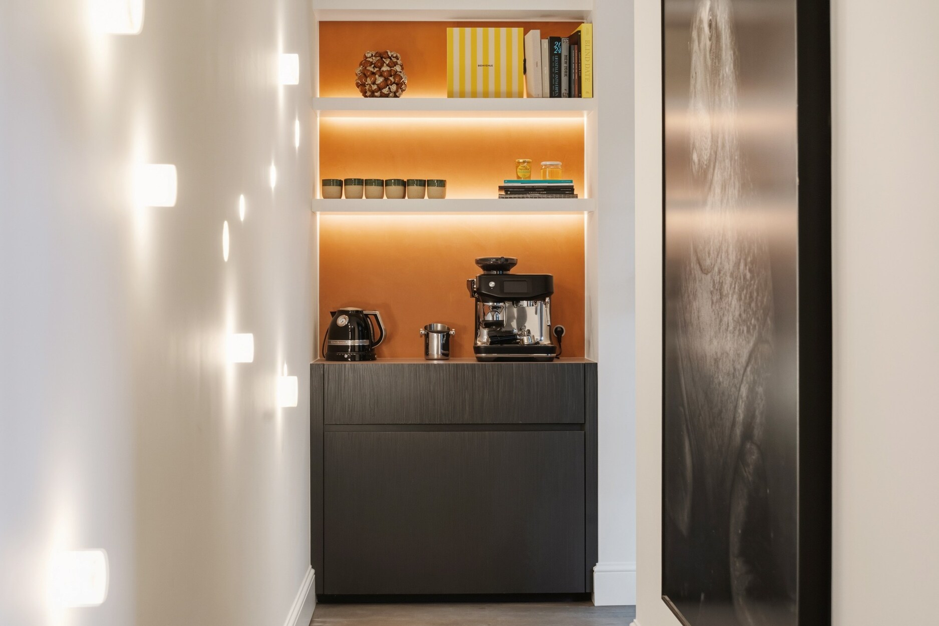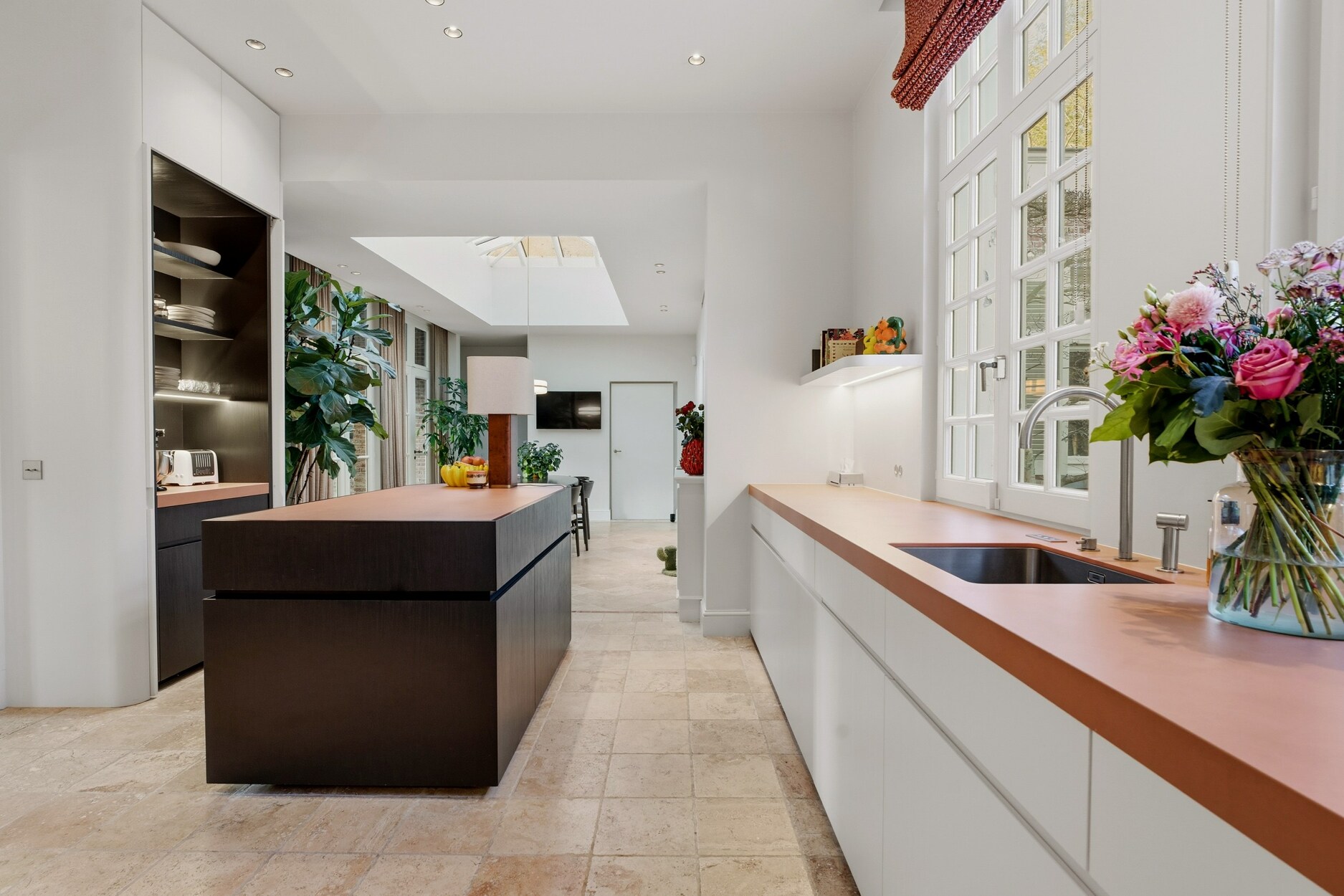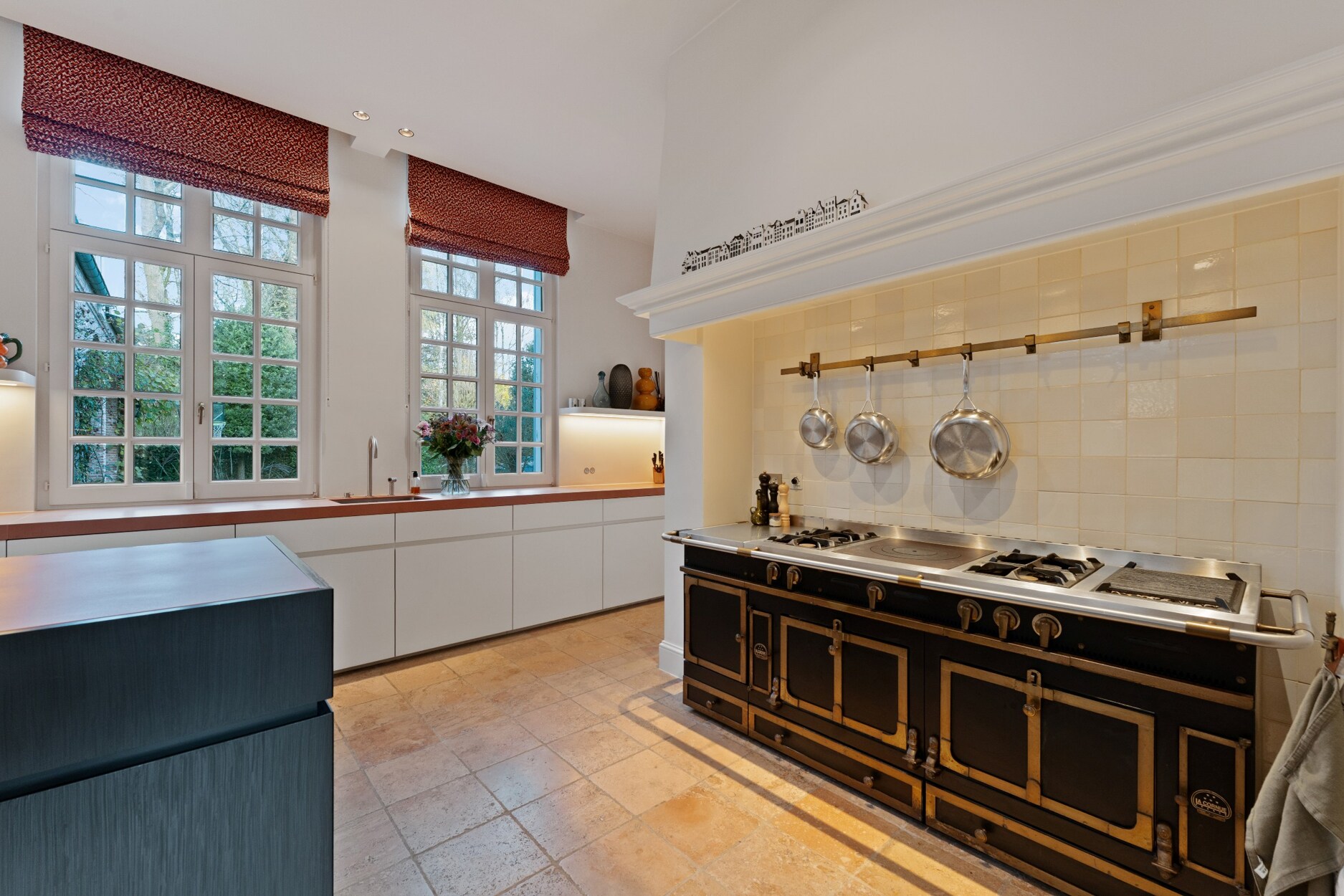 De volledig vernieuwde leefkeuken met centrale eetplaats onder een spectaculaire glazen dakkoepel vormt het warme hart van de woning. De keuken is uitgerust met maatwerkkasten, natuurstenen werkbladen, hoogwaardige toestellen en vloerlange gordijnen die uitgeven op het terras. Aansluitend bevindt zich een praktische, ruime bijkeuken.