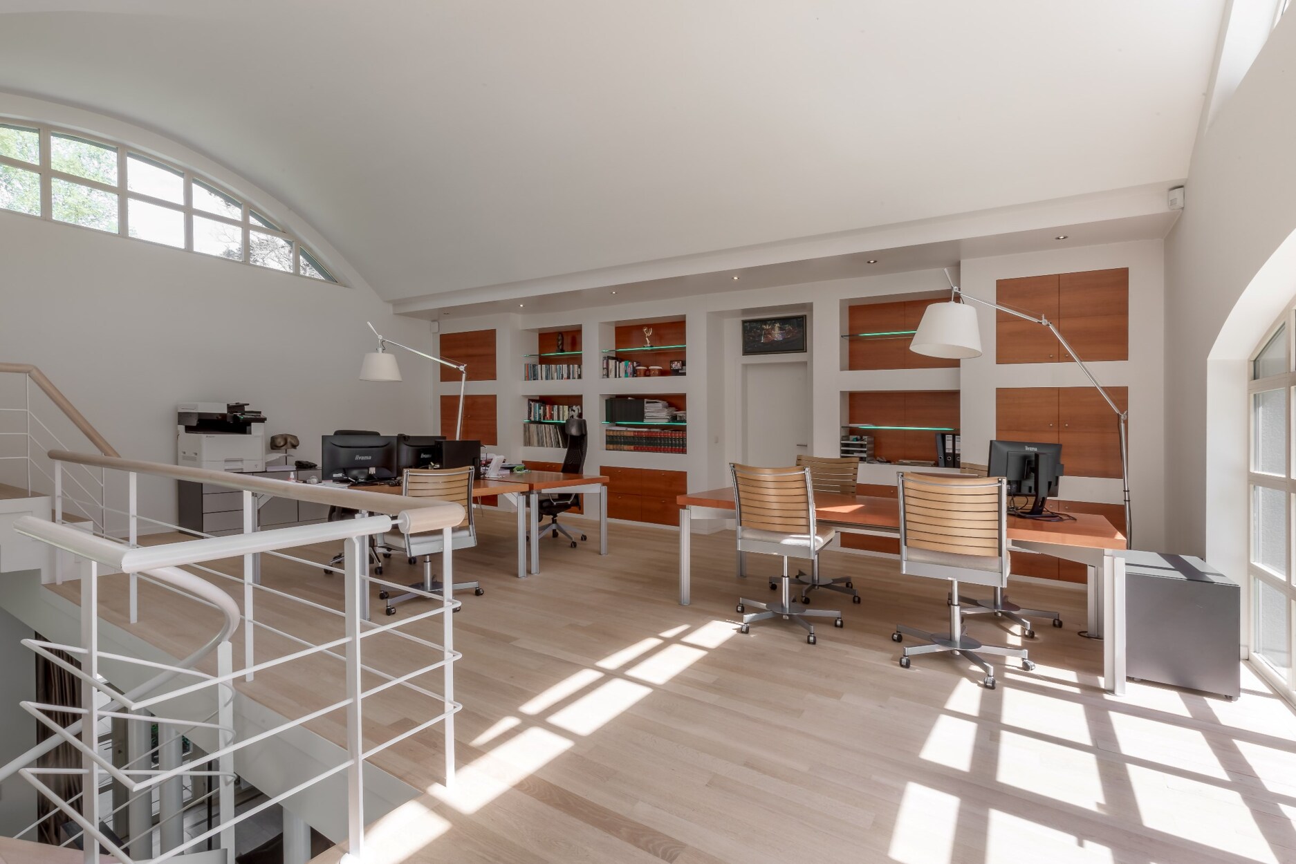 We betreden de woning via een ruime inkomhal met gastentoilet en vestiaire. Deze centrale hal geeft enerzijds uit op de riante en lichtrijke woonkamer met indrukwekkende vide. Hier vinden we verschillende zitruimtes en een eetkamer. De mezzanine wordt momenteel gebruikt als een fantastische home office met een leuk contact met de woonkamer en eigen zonnig terras.